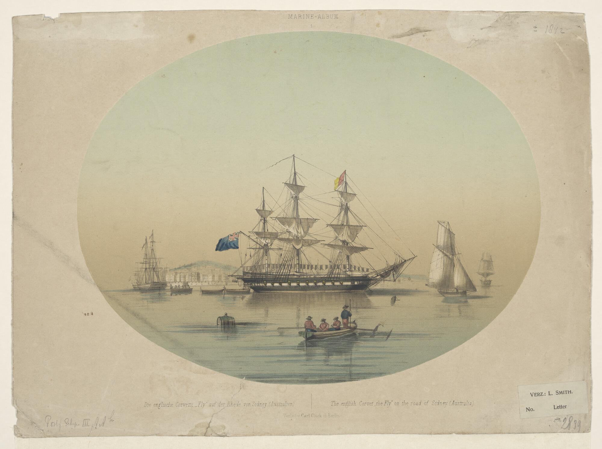 Het Engelse korvet "Fly" op de rede van Sidney.