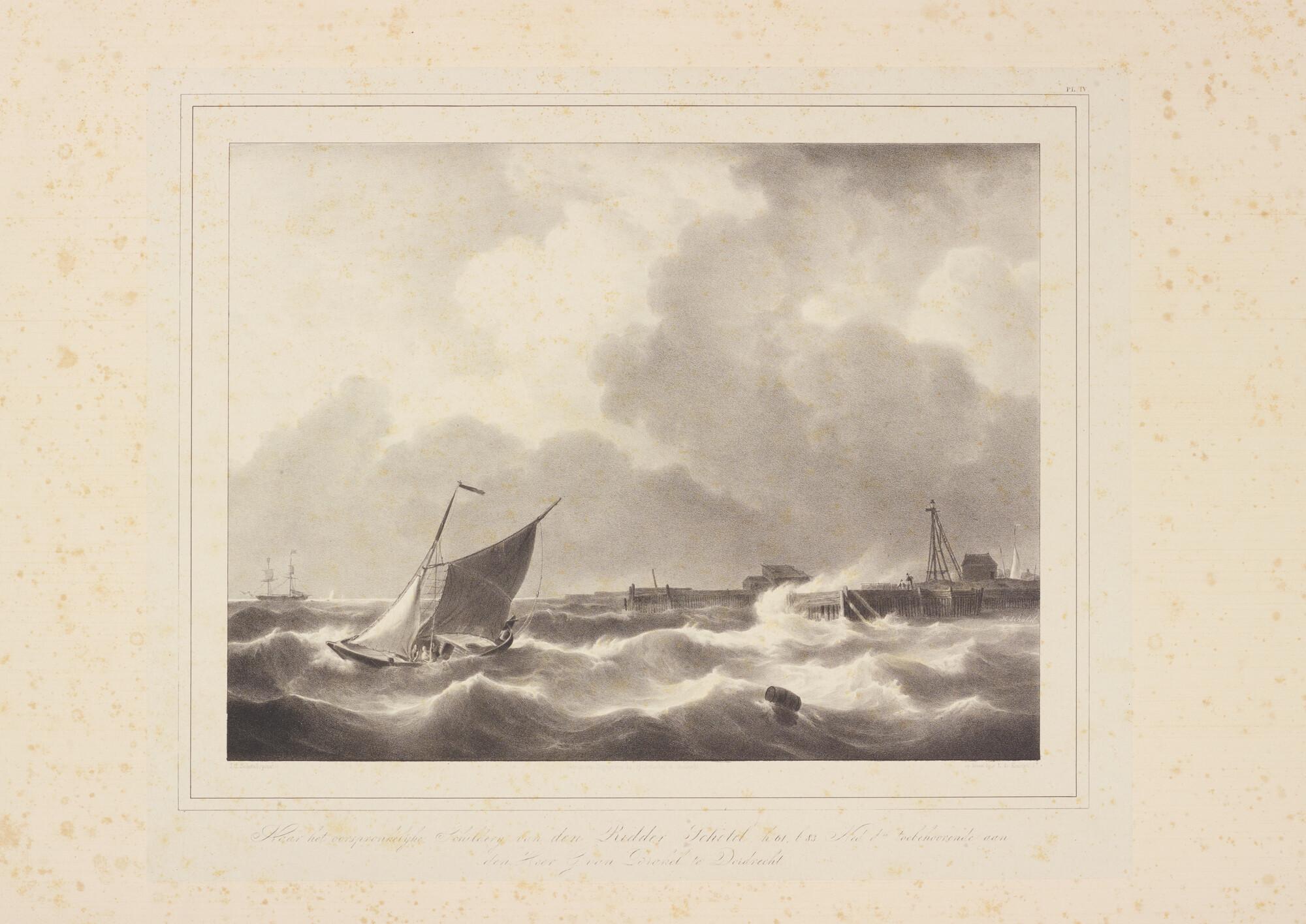Hoogaars in stormachtig weer, nabij een havenhoofd, prent naar een schilderij door J.C. Schotel.
