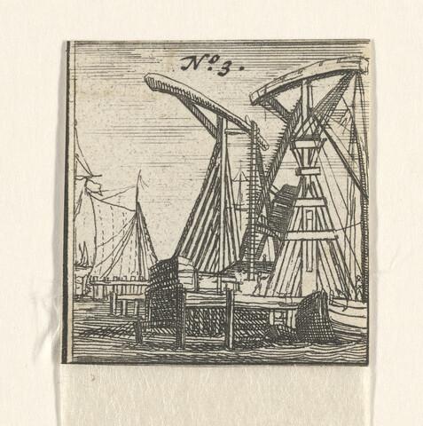 Prent met afbeelding van scheepskranen in het IJ te Amsterdam.