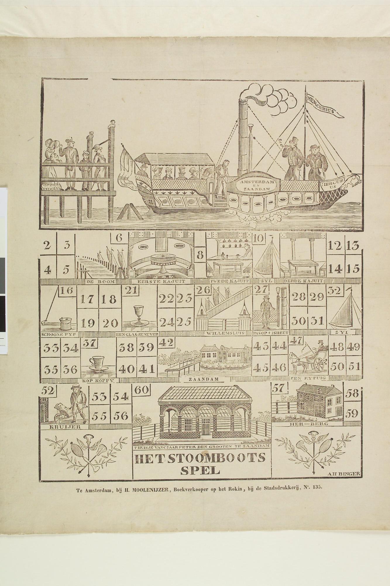 'Het Stoomboots spel' Bovenin afbeelding van de raderstoomboot "Mercurius", daaronder 60 vakjes genummerd; nr. 60 is het Czaar Peterhuisje te Zaandam