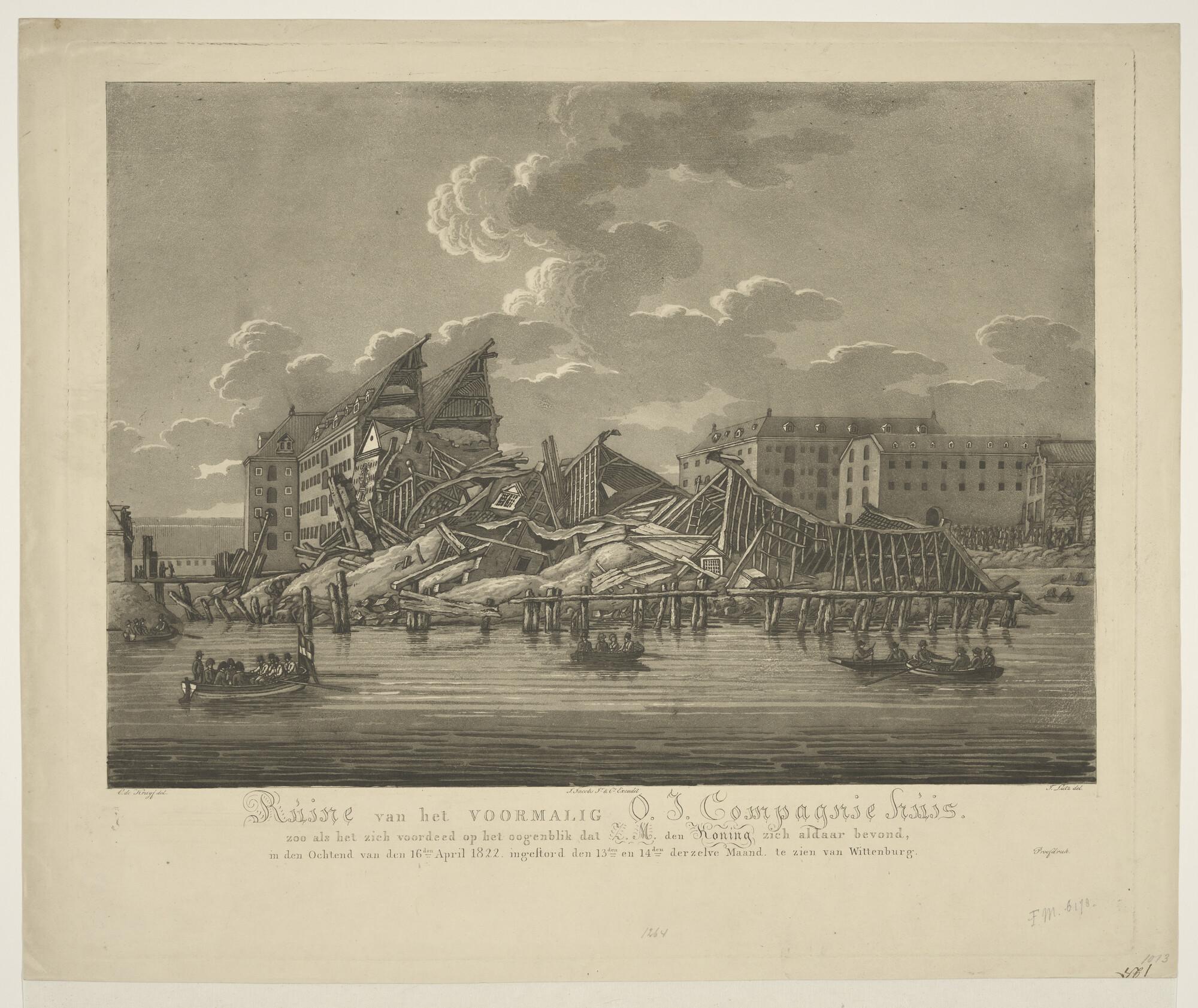 Ruine van het Oostindisch Huis te Amsterdam, tijdens het bezoek van koning Willem I, gezien vanaf Wittenburg. Eèn prent uit "Eene verzameling van twaalf afbeeldingen van het instorten van het magazijn der O.I. Compagnie te Amsterdam 1822".