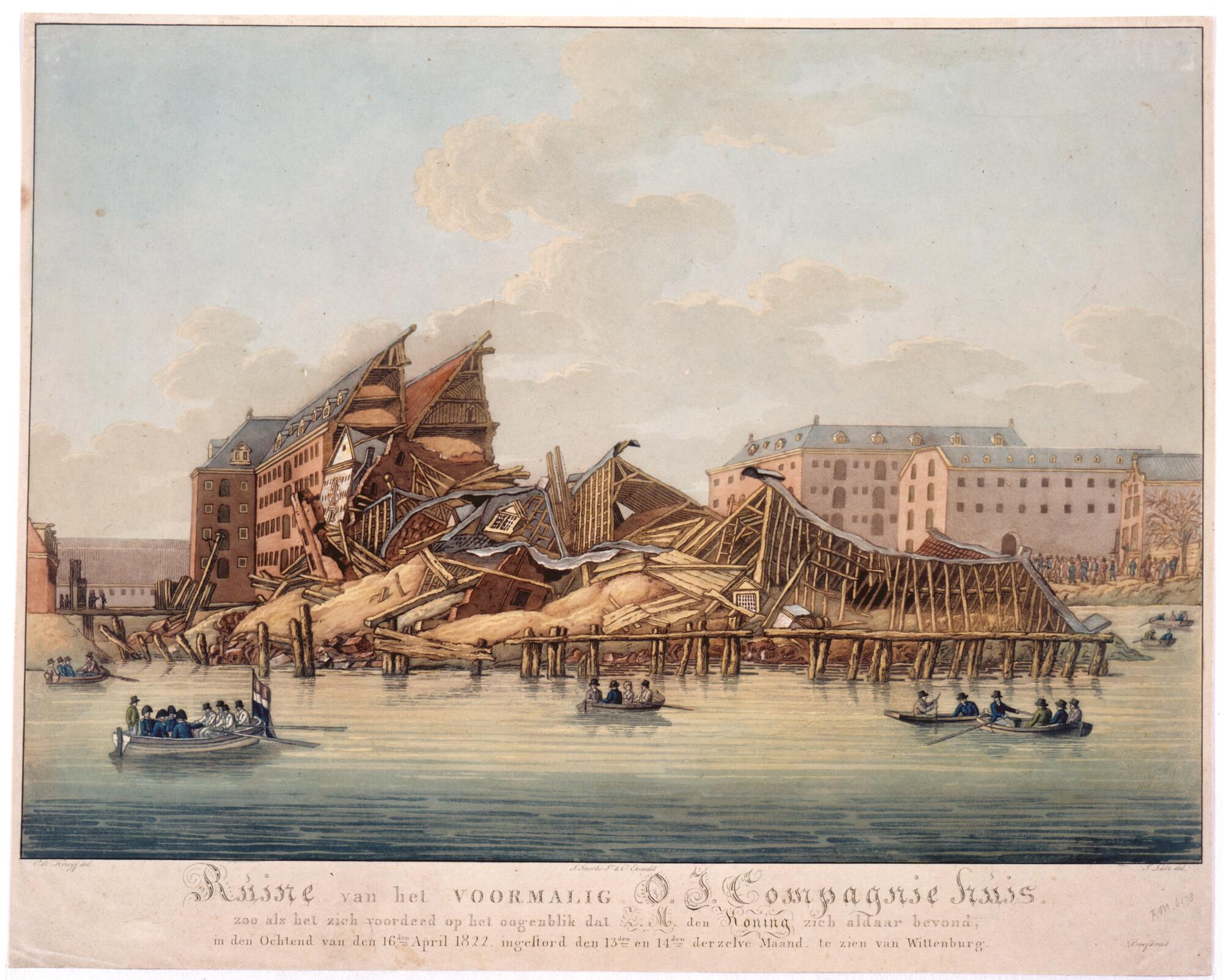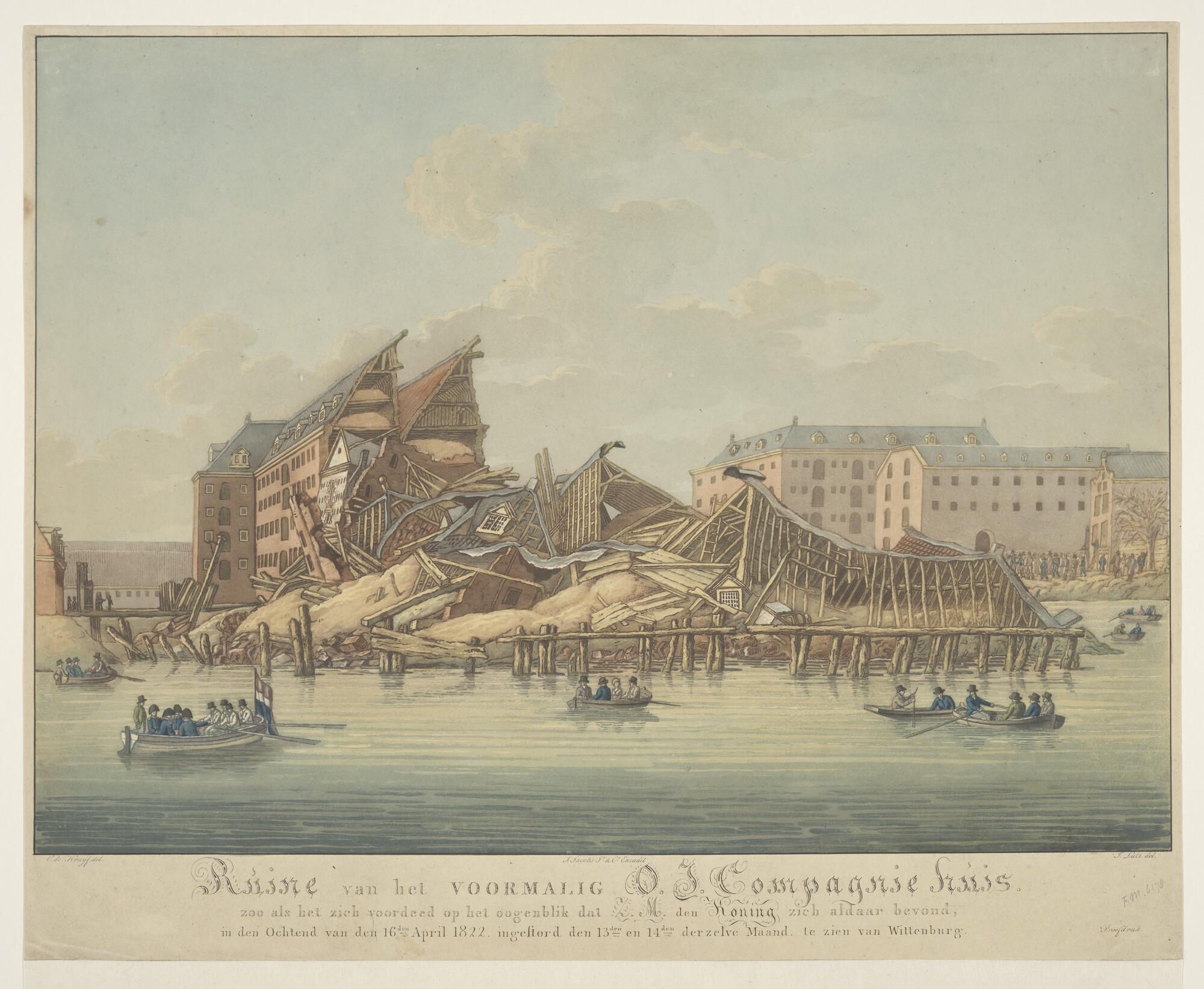 Ruine van het Oostindisch Huis te Amsterdam, gezien van Wittenburg. Eèn prent uit "Eene verzameling van twaalf afbeeldingen van het instorten van het magazijn der O.I. Compagnie te Amsterdam 1822".