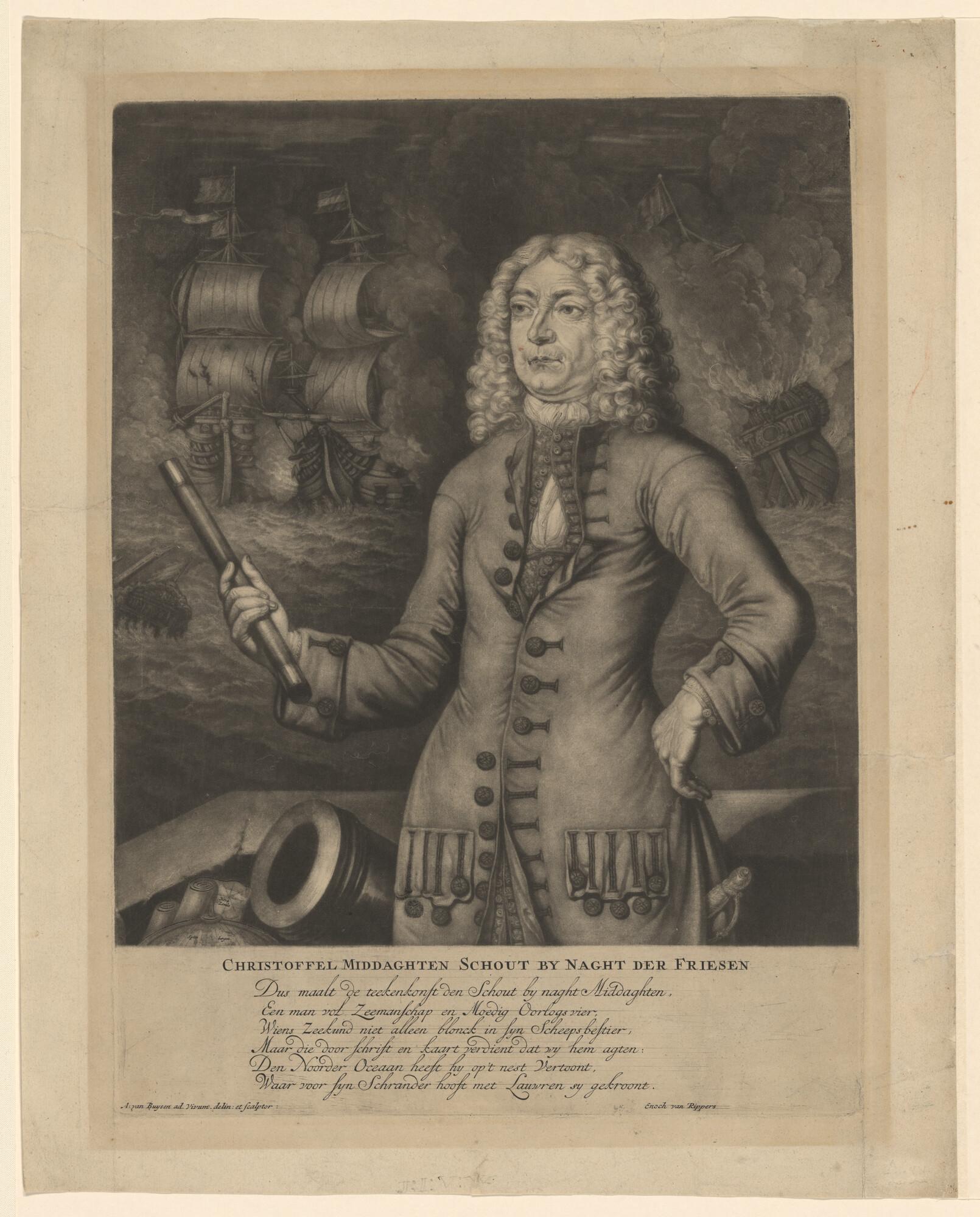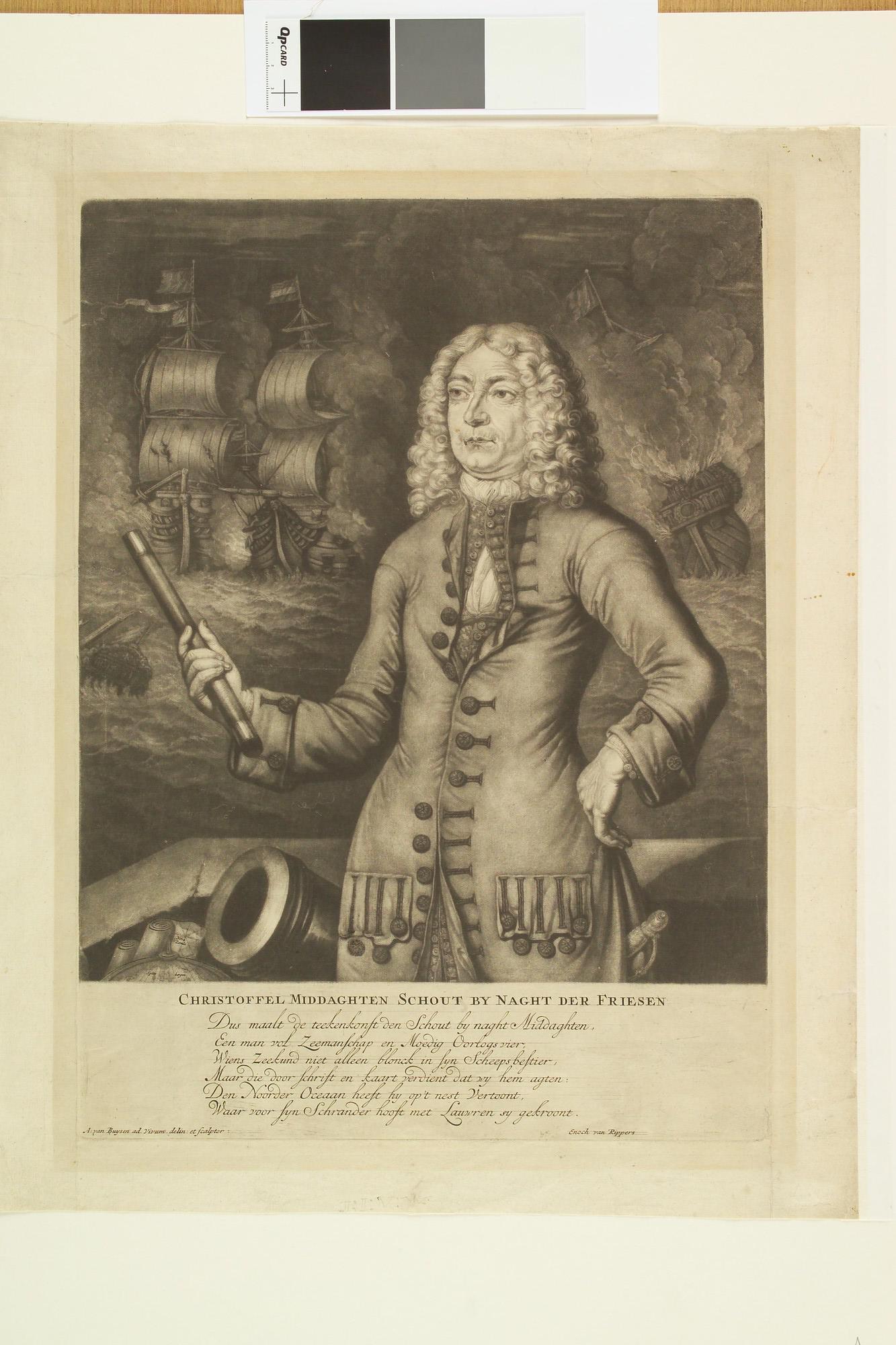 Portret, kniestuk, van Christoffel Middagten (1665-1723), schout-bij-nacht van Friesland, linksonder een kaart en een globe met de namen Nova Zembla en Spitsbergen; op de achtergrond een zeeslag, onder het portret een zesregelig lofdicht door Enoch van Rippers.