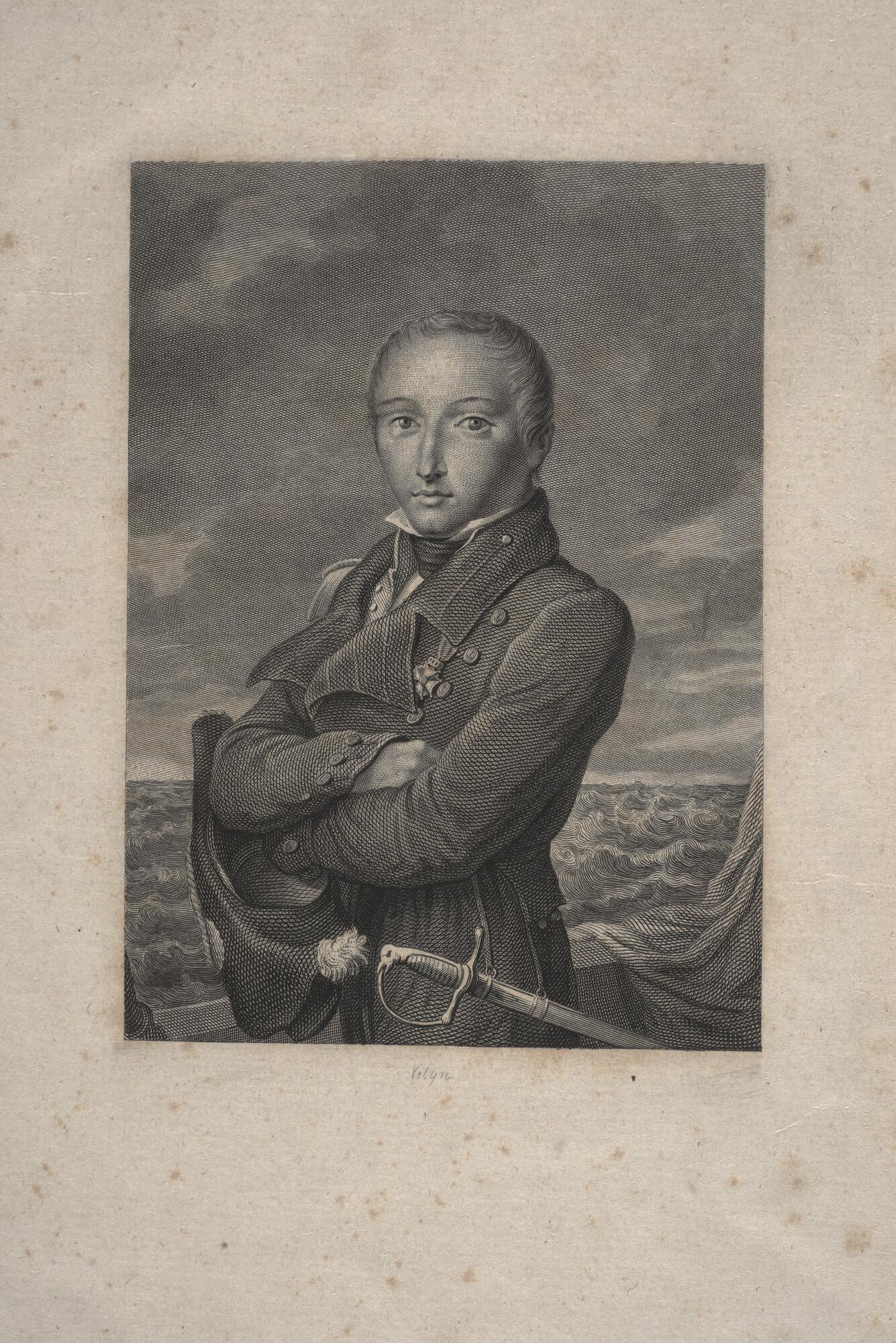 Portret van J.C.J. van Speyk te halver lijve, met over elkaar geslagen armen, voor de letter.