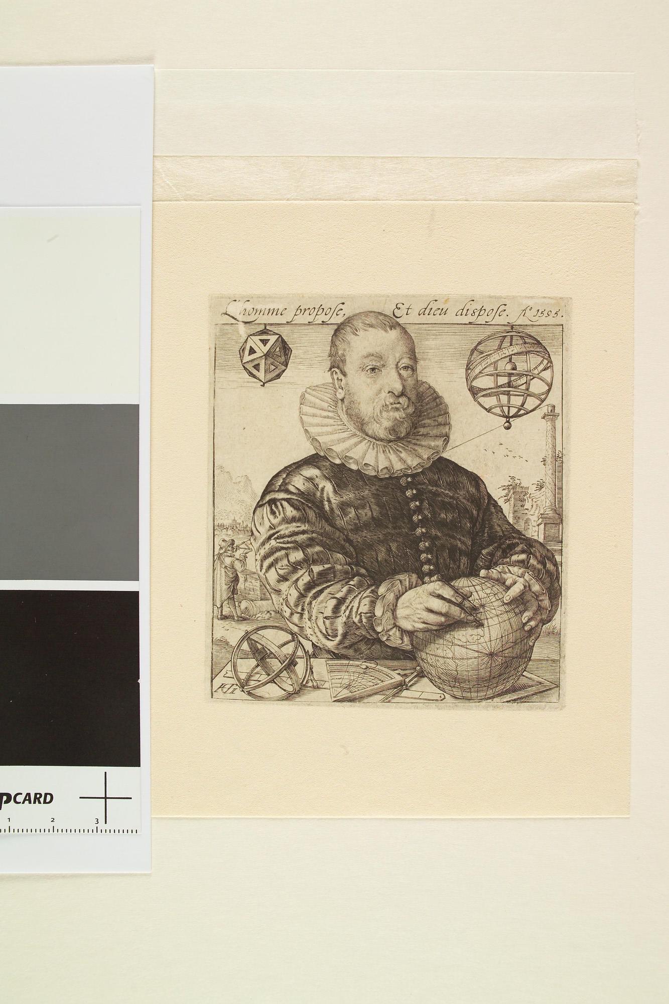 Portret van de wiskundige en astronoom Nicolaas Petri van Deventer, met in zijn handen een aardglobe en om zich heen astronomische instrumenten.