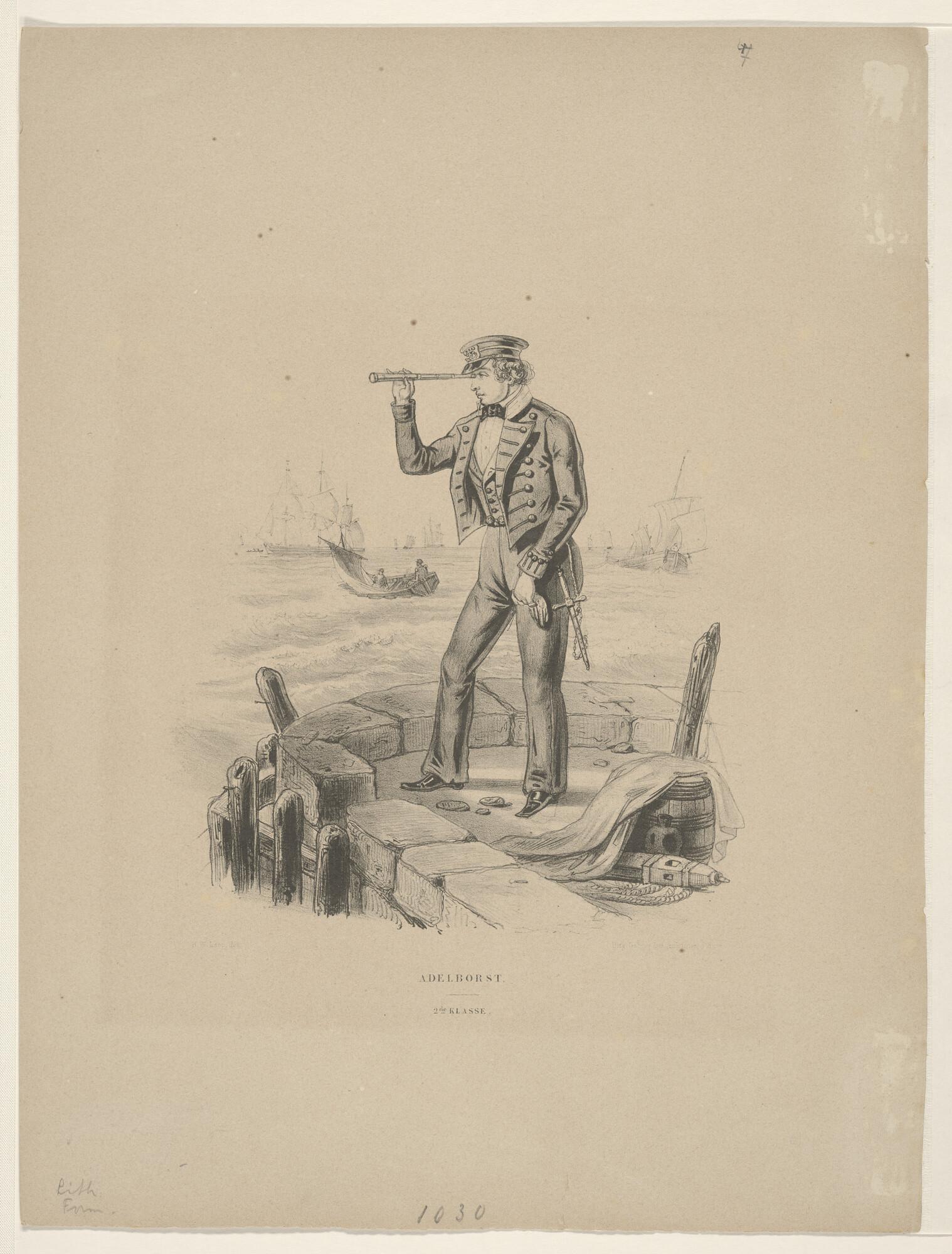 Adelborst Tweede Klasse, ten voeten uit, staande op een havenhoofd