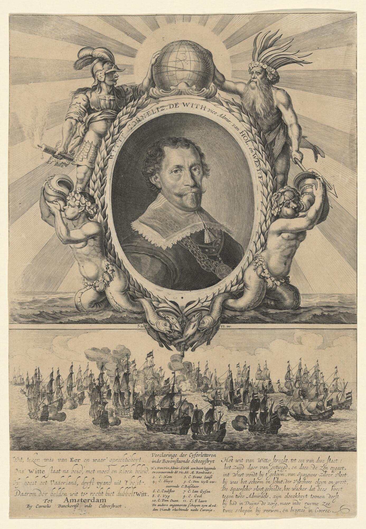 Portret van Vice-Admiraal Witte Cornelisz. de With, in cartouche met allegorische figuren; onder het portret een zeeslag, daaronder een twaalfregelig vers en legenda.