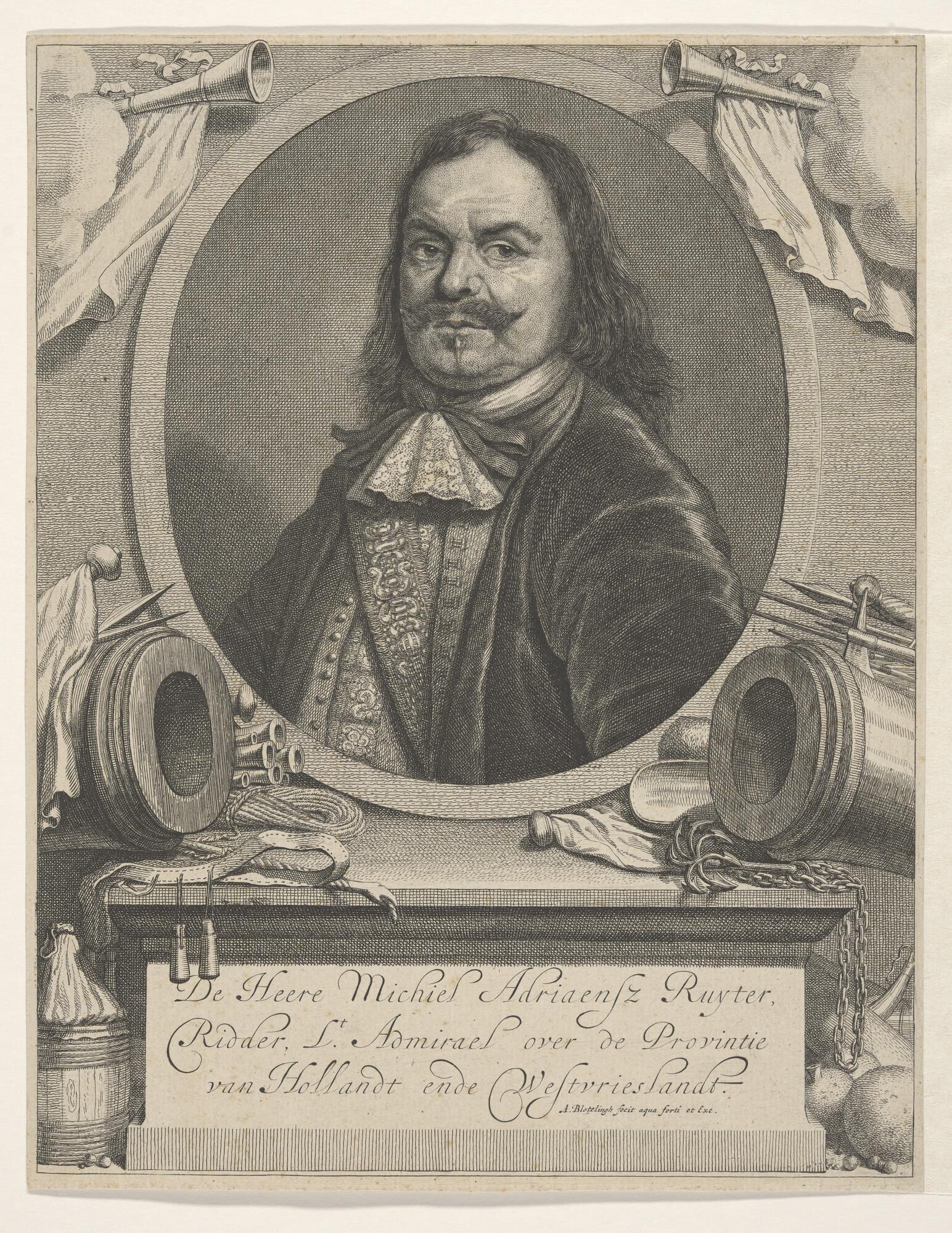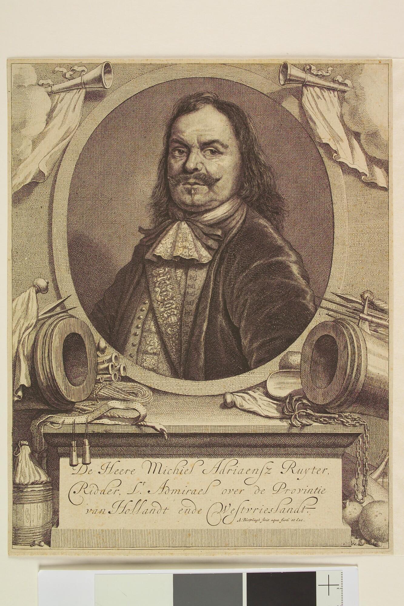 Portret van Michiel A. de Ruyter, borststuk naar voren en rechts in ovaal, met links en rechts twee kanonnen op voetstuk.