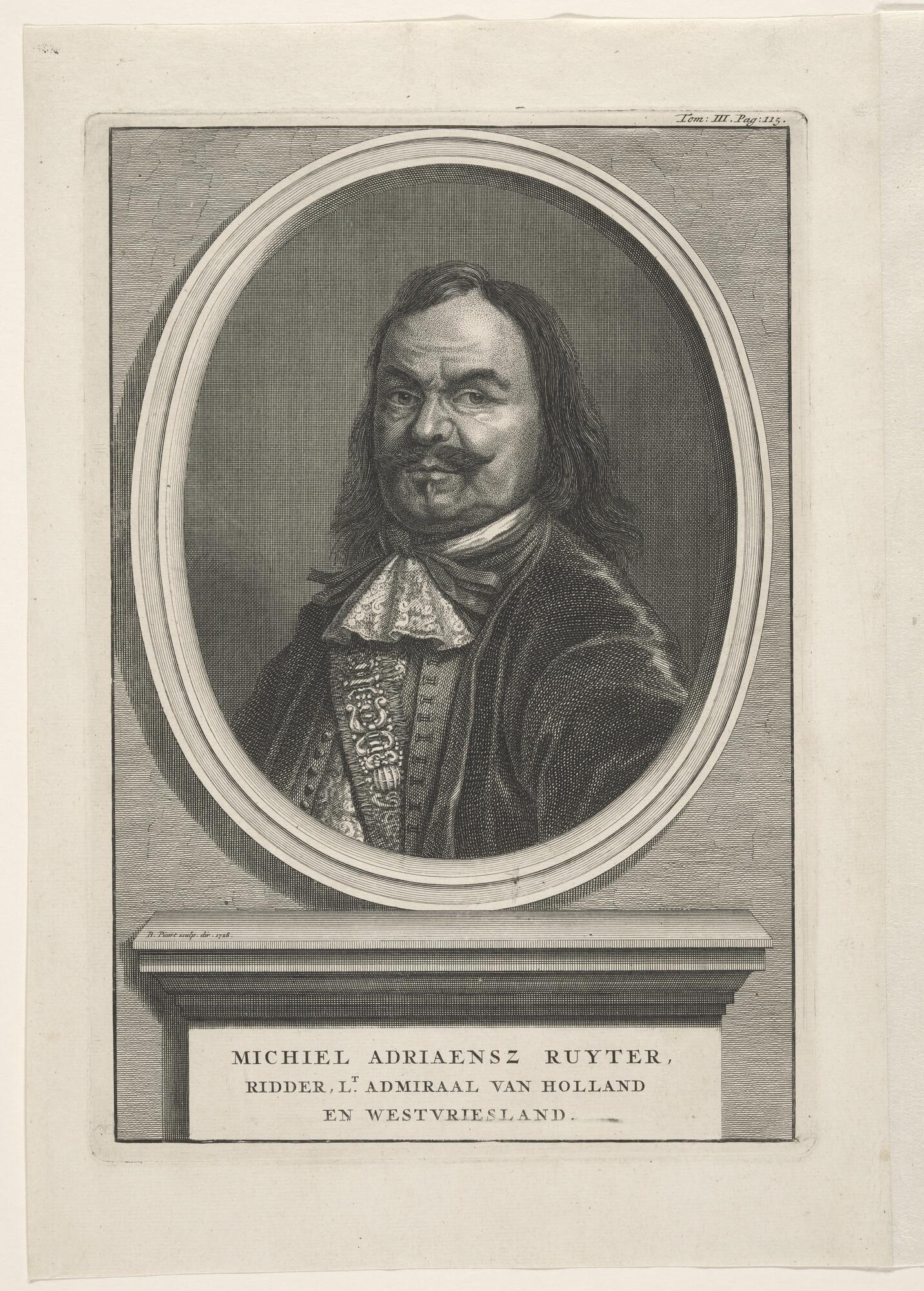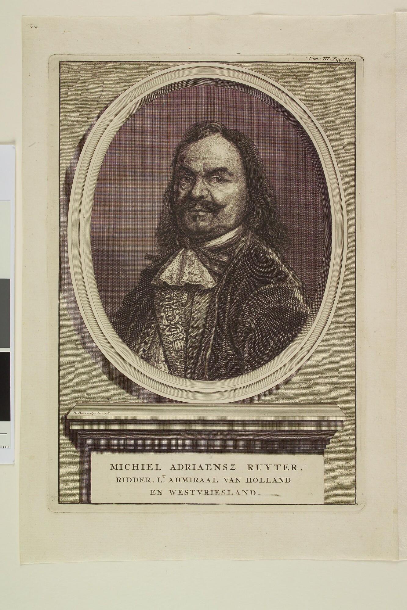 Portret van Michiel de Ruiter, borststuk naar voren en rechts, met daaronder