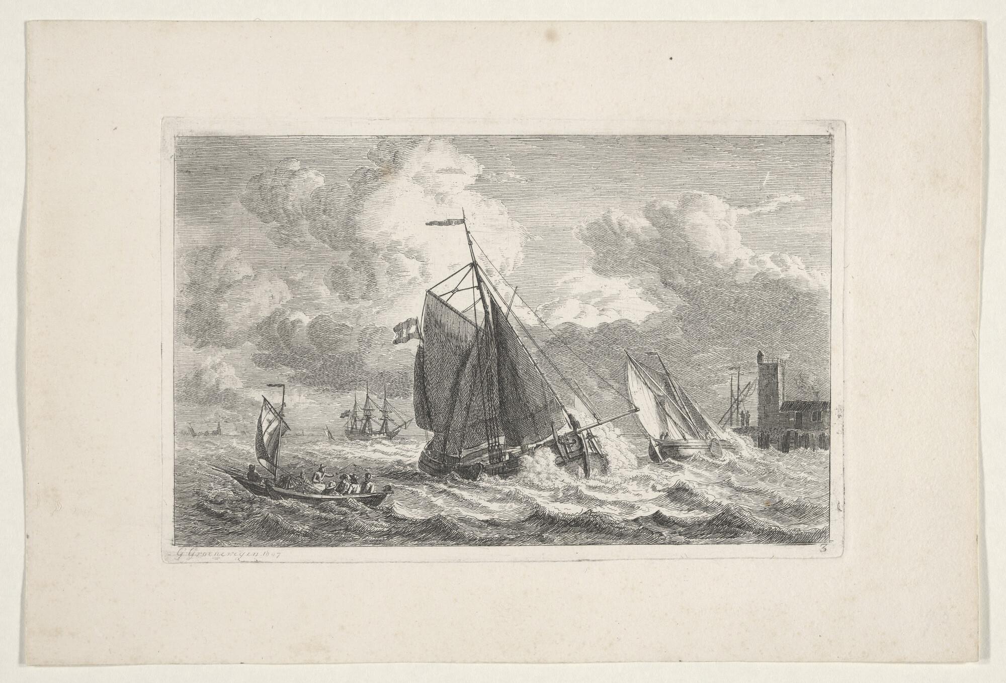 Serie van zes prenten, nummer 3: Scheepvaart op een rede, in het midden een paviljoenpoon, rechts een havenhoofd met een vierkante toten.