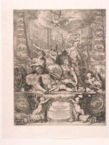 Zinneprent ter ere op de dood van Michiel de Ruyter; de Ruyter liggend als zieke held omringd door allegorische figuren en beelden van zijn krijgsverrichtingen.