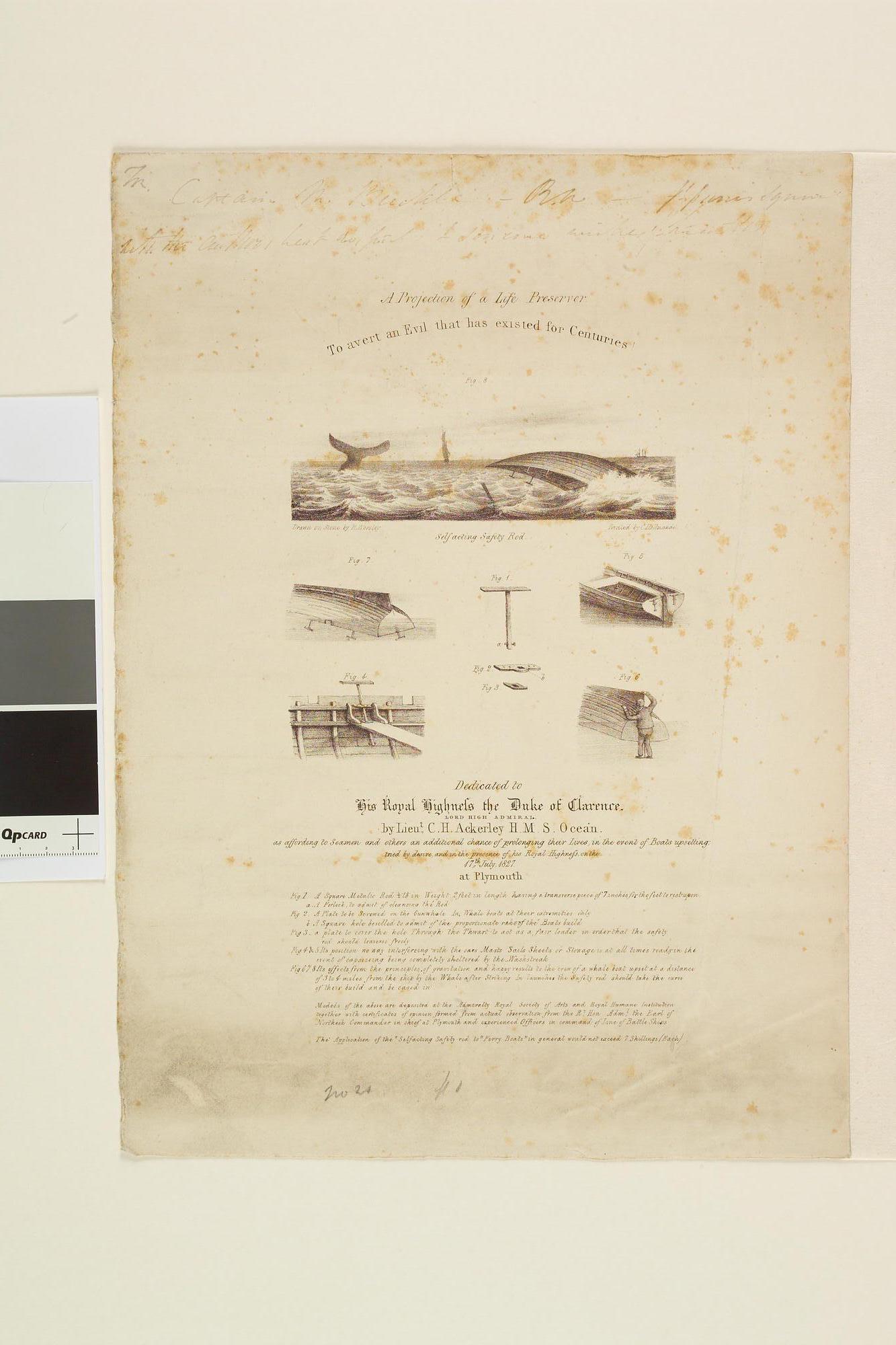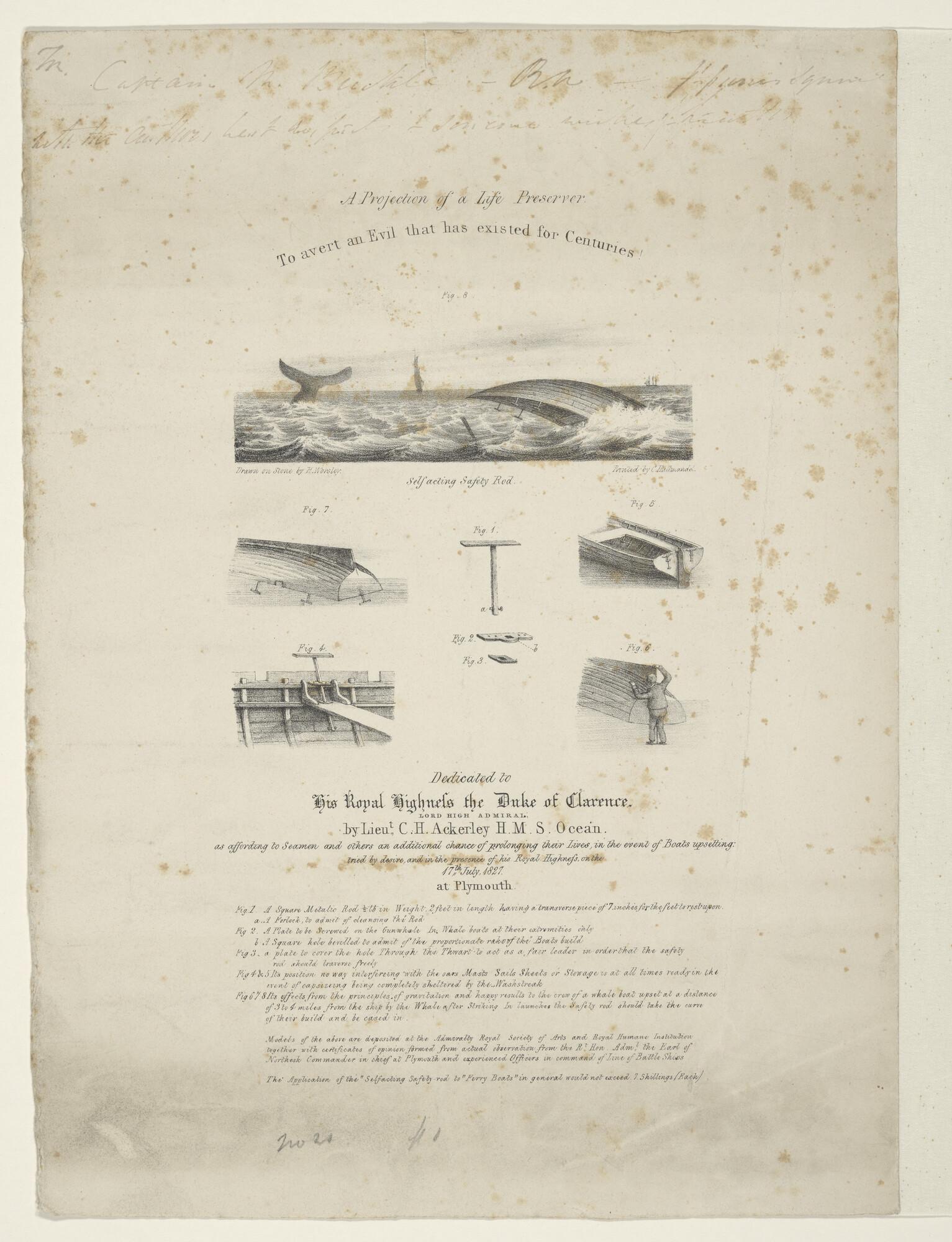 Beschrijving van de 'self acting safety rod', bedoeld als ondersteuning van de voeten van drenkelingen die zich vastklampen aan een omgeslagen boot: 8 afbeeldingen en tekst.