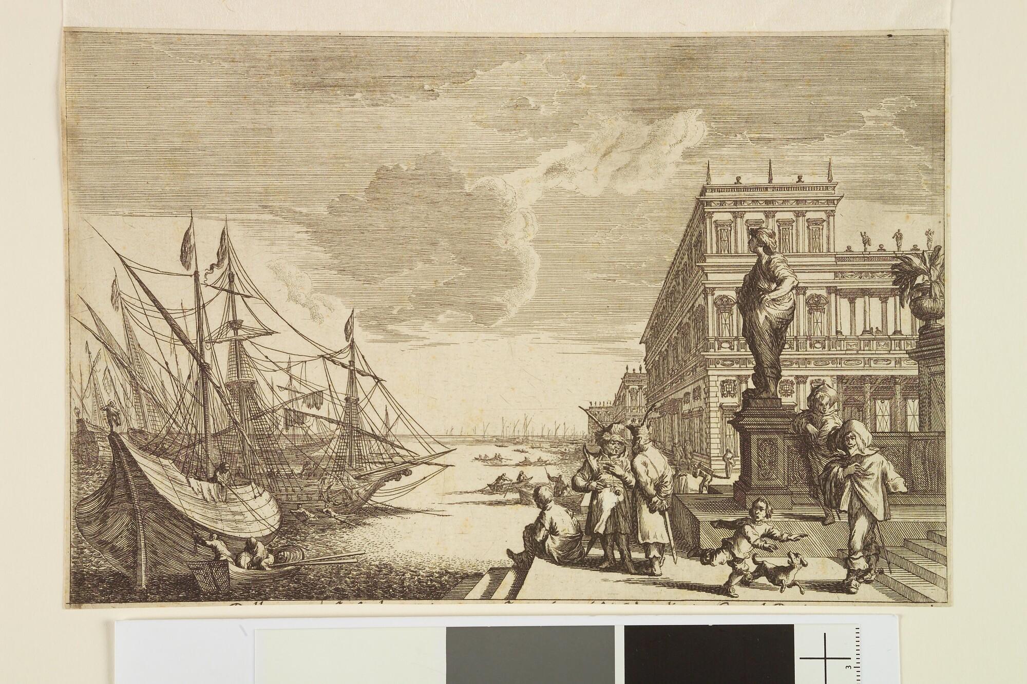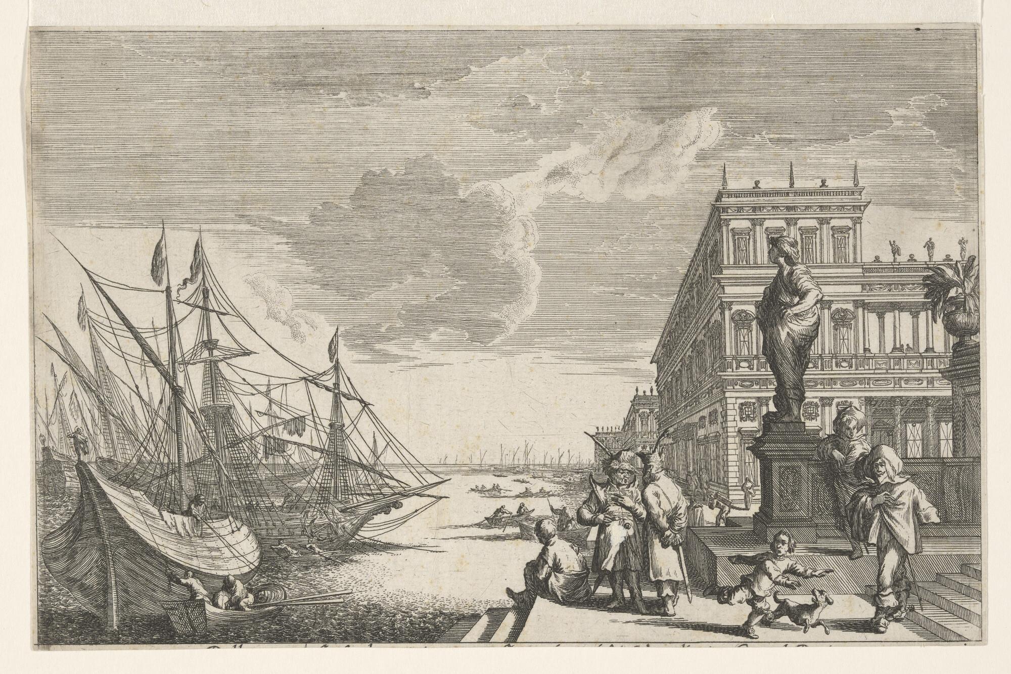 Prent uit een reeks met zeehavens en paleizen in Italië, uit de serie "Underschidliche Meer Porten und Pallazzia von Joh. Willhelm Bauren in Italia nach dem Leben gezeichnet". Mensen op een bordes bij een haven, waaronder een kind met een hondje. Links enige zeeschepen voor anker. Nummer 11 van 12.