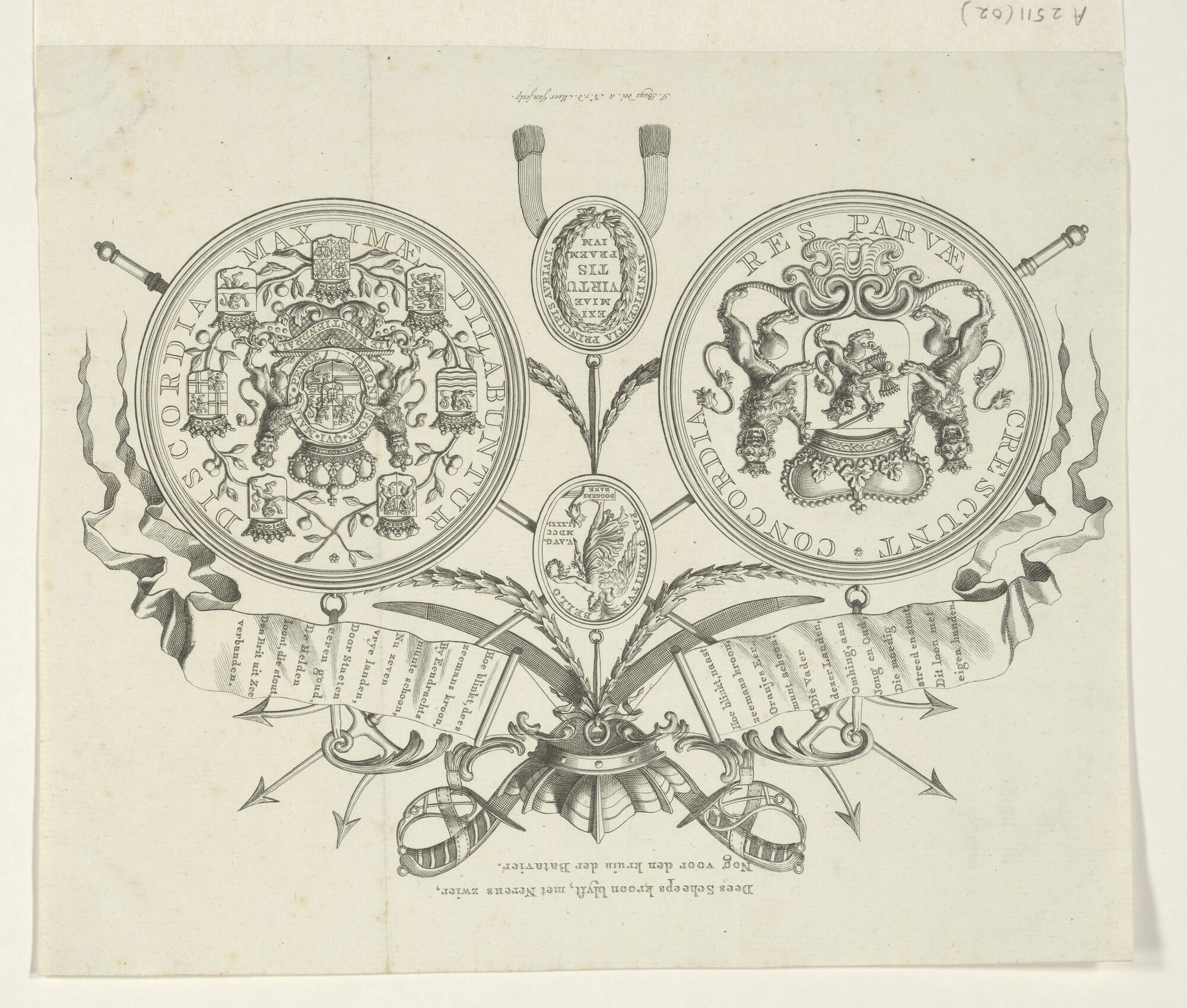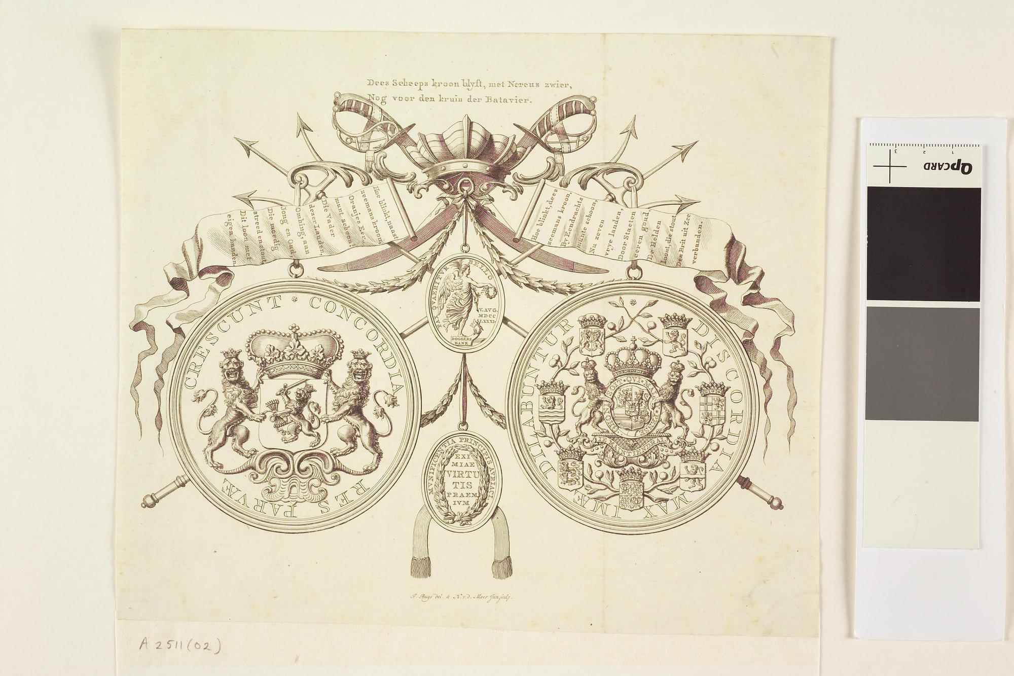 Afbeelding van de gouden Doggersbank-medaille, uitgereikt door Willem V aan Admiraal Zoutman; bekroond met een scheepskroon, en omlijst met drietanden, banieren en medailles met betrekking tot de Republiek en de zeven provinciën.