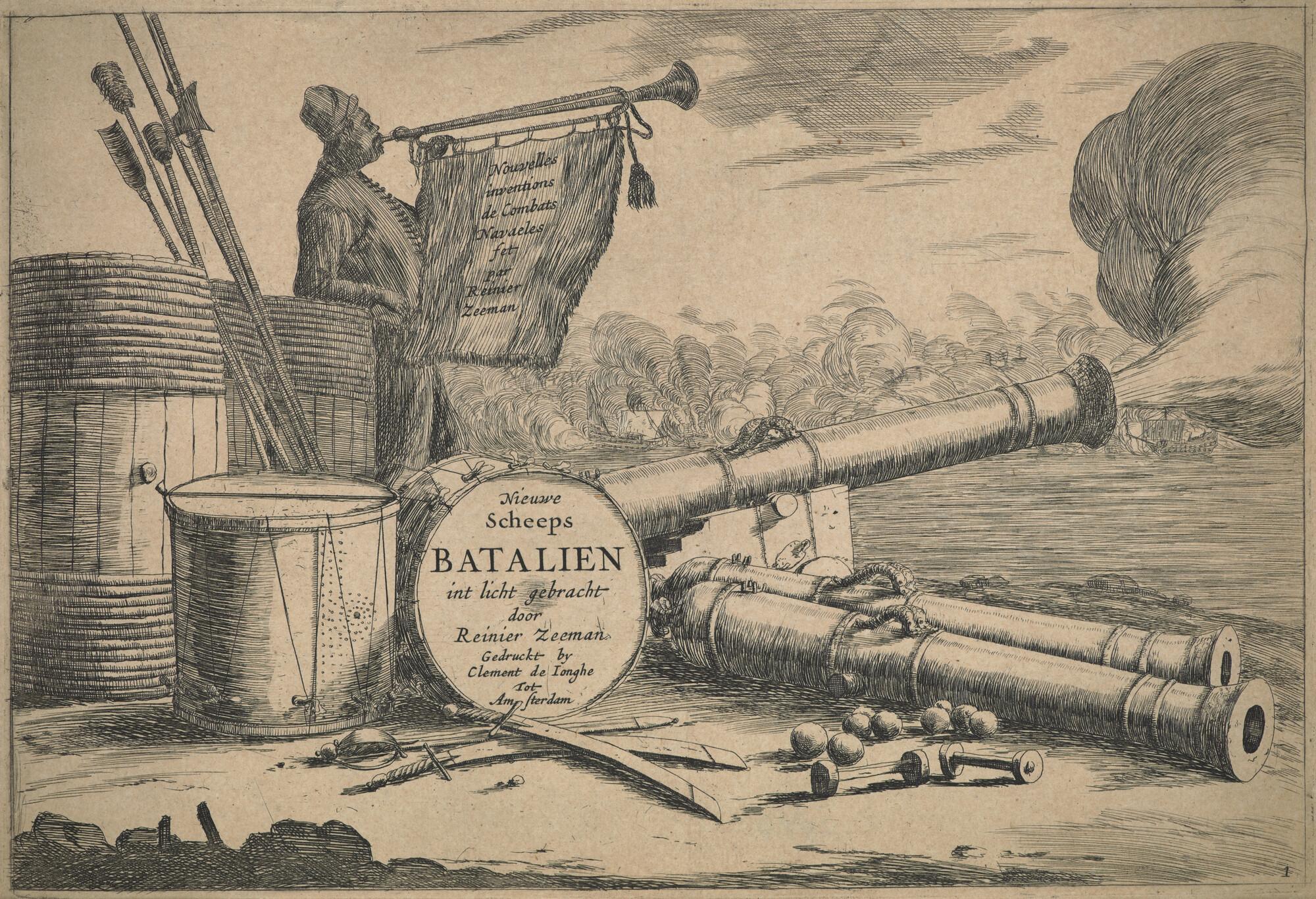 Prent van een trompetter, geschut, wapens en vaten. Titelprent, ets nummer 1 van de suite van acht etsen "Nieuwe Scheeps Batalien".