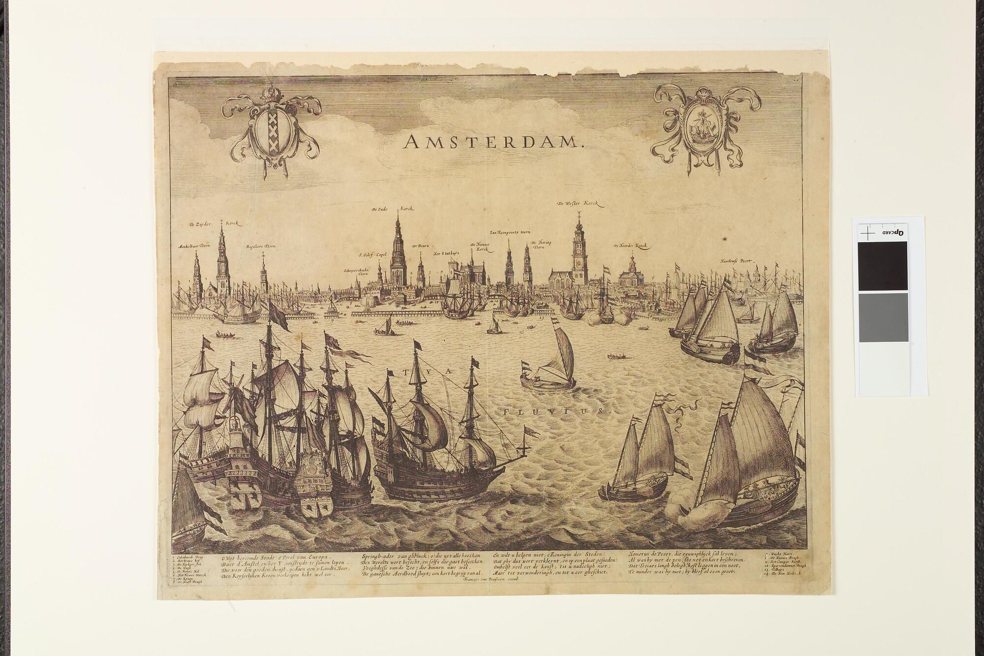 Gezicht op Amsterdam vanaf het IJ. Links enige oorlogsschepen waaronder de "Amelia", rechts een aantal jachten.