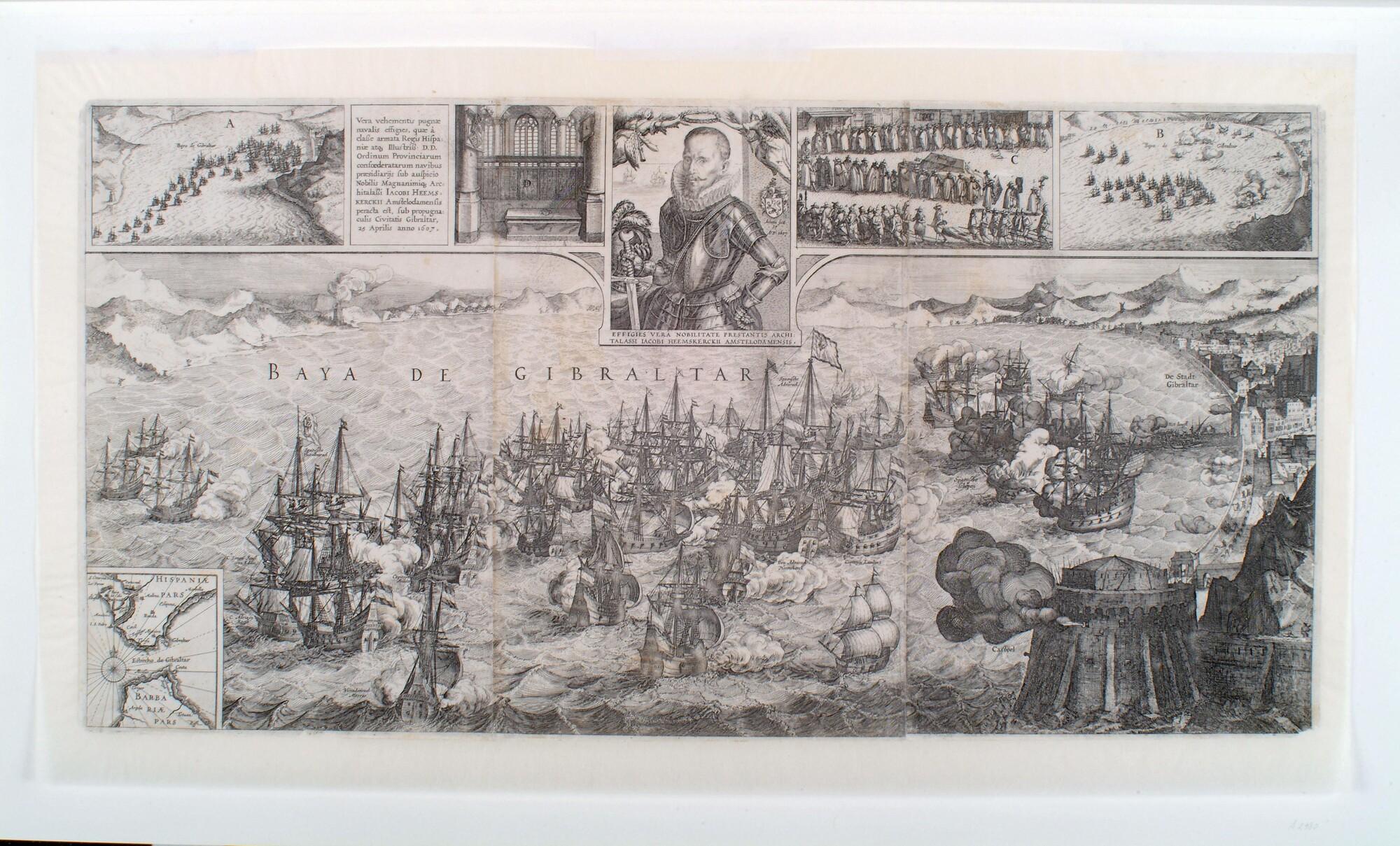 Uitvoerige voorstelling van de zeeslag bij Gibraltar, met gezicht op de baai van Gibraltar en aan de bovenzijde vijf afbeeldingen, van onder meer een portret van Van Heemskerck.