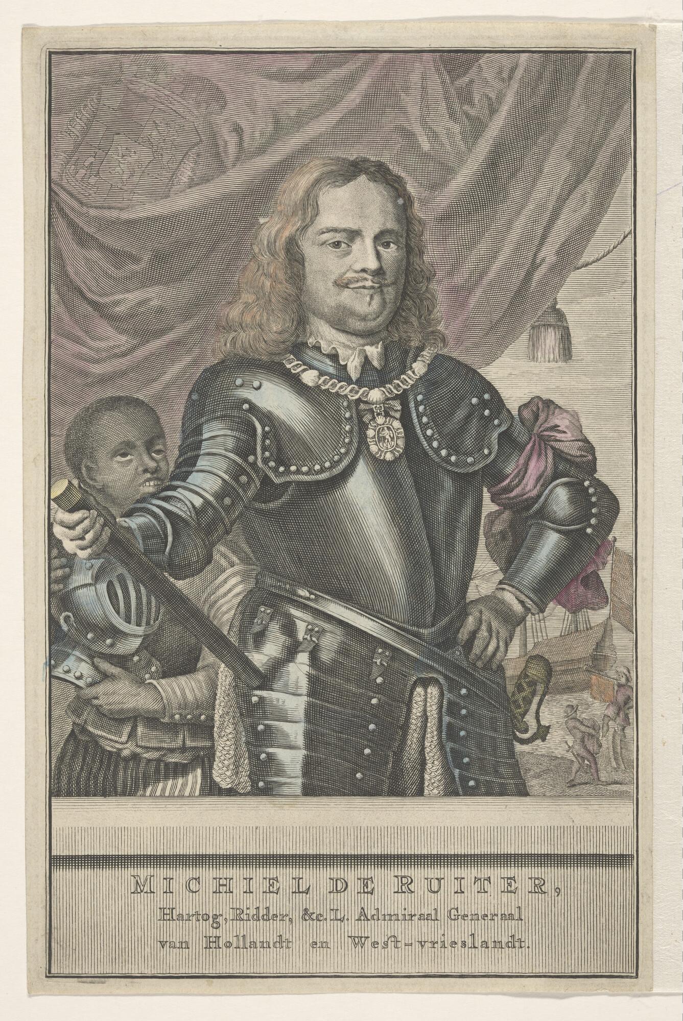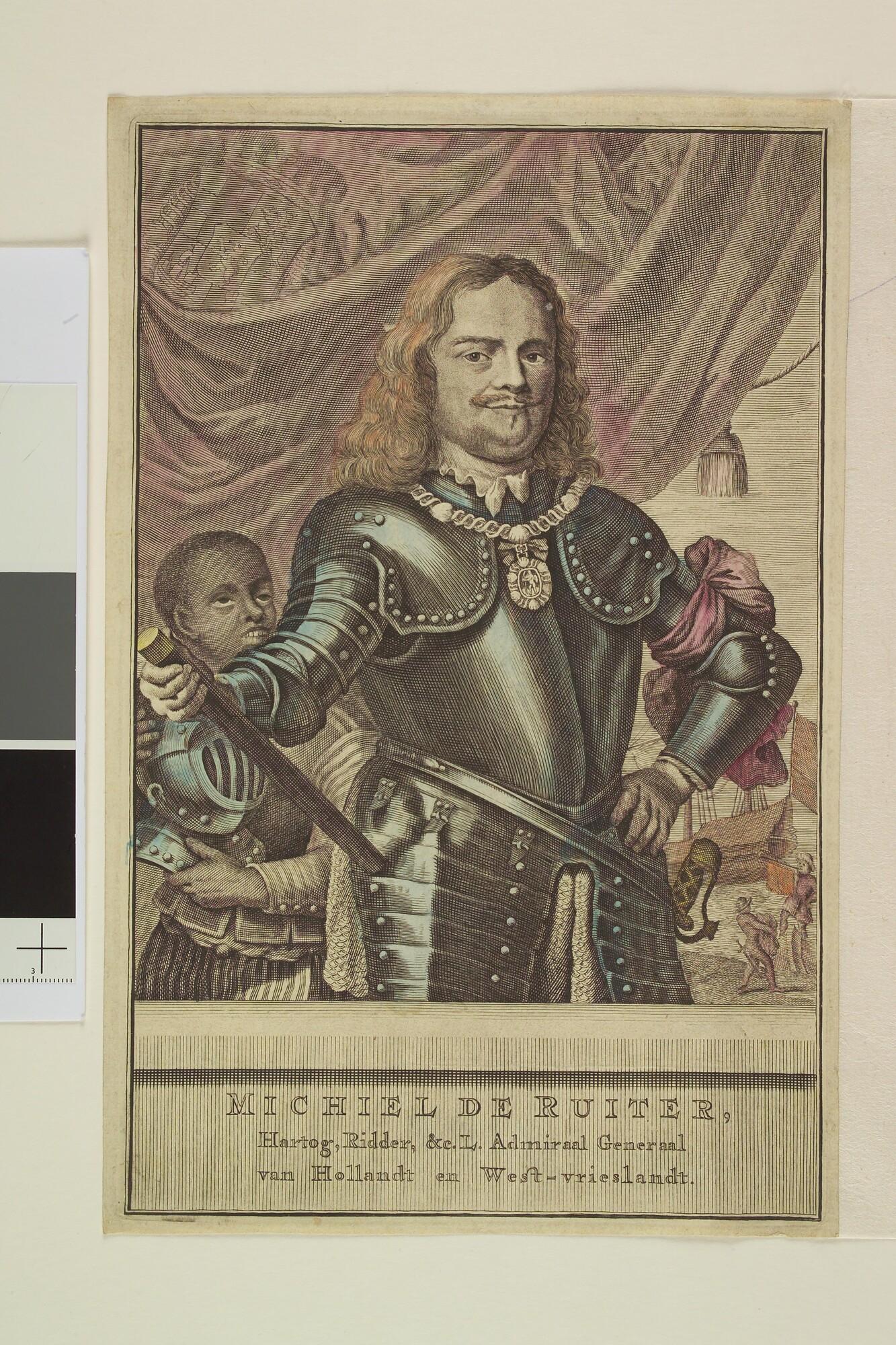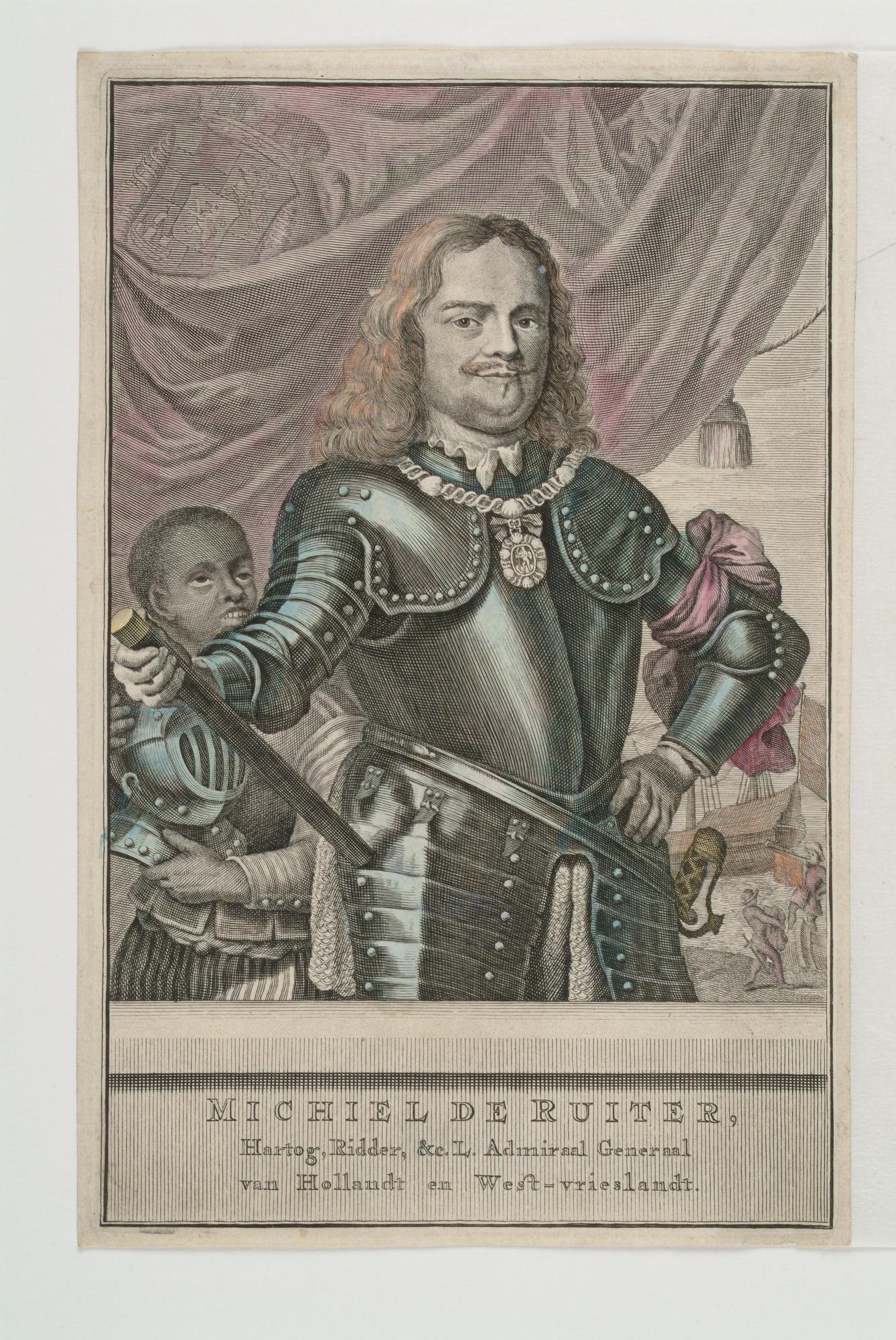 Portret van Michiel de Ruiter, geharnast heupstuk, met commandostaf in de rechterhand, met links een zwart jongetje.