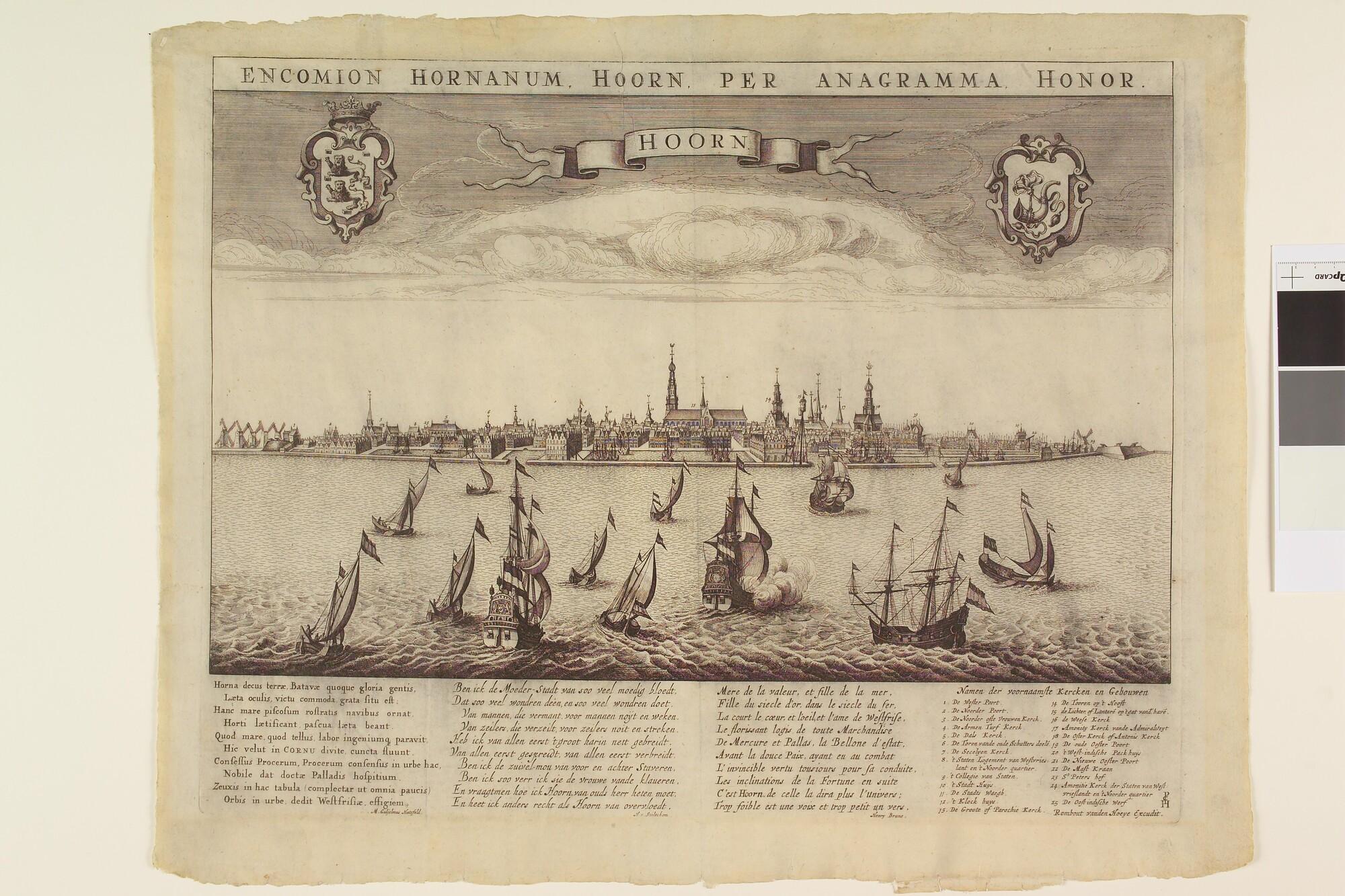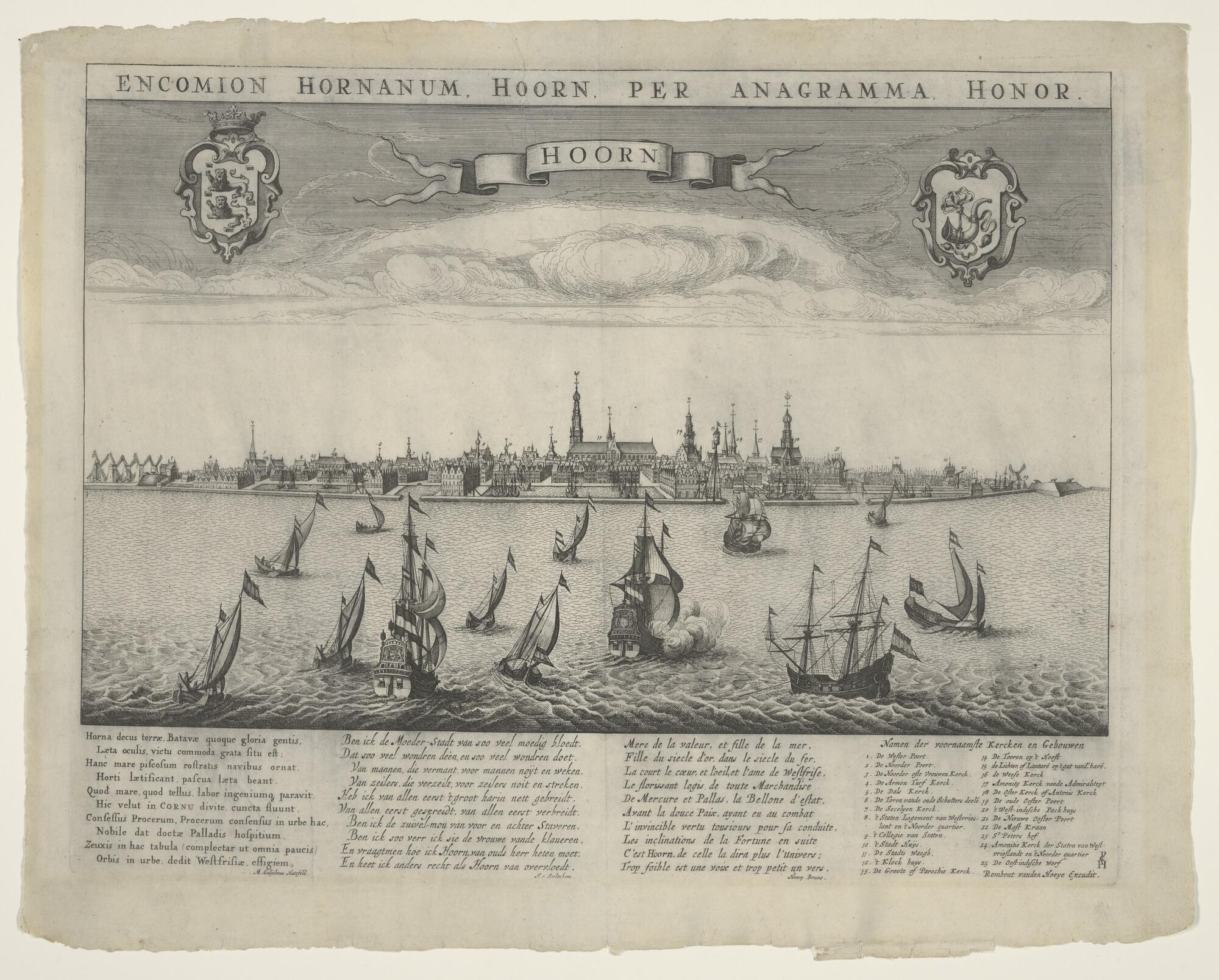 Scheepvaart op de rede van Hoorn met onderschrift in Latijn, Nederlands en Frans.