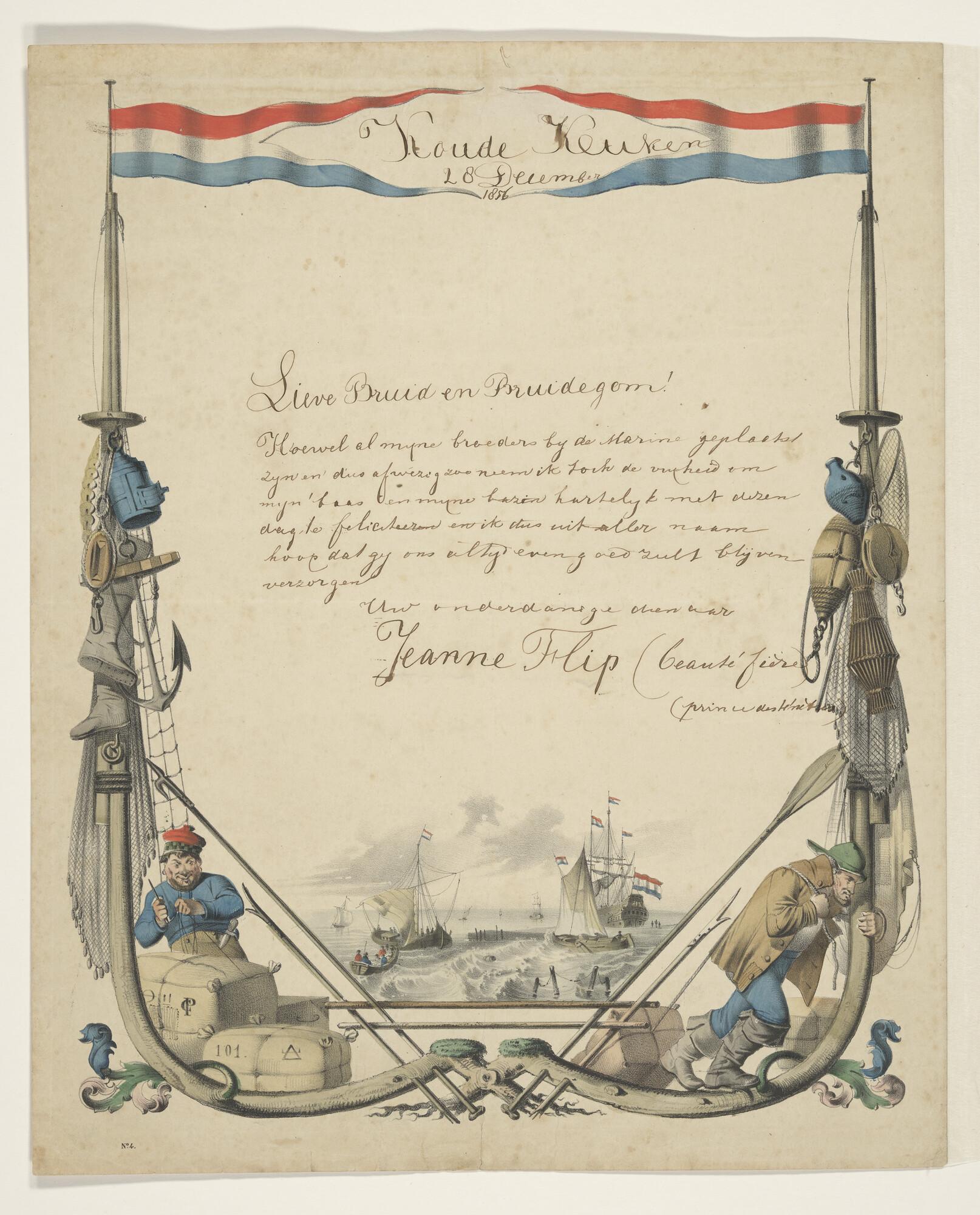 Gelukwens: gezicht op een rede, met op de achtergrond een zeventiende-eeuws schip, op de voorgrond een haveningang met in- en uitvarende kleine vaartuigen, een binnenschip en een kustvaarder, het geheel omraamd met scheepsonderdelen en visserij-benodigdheden.