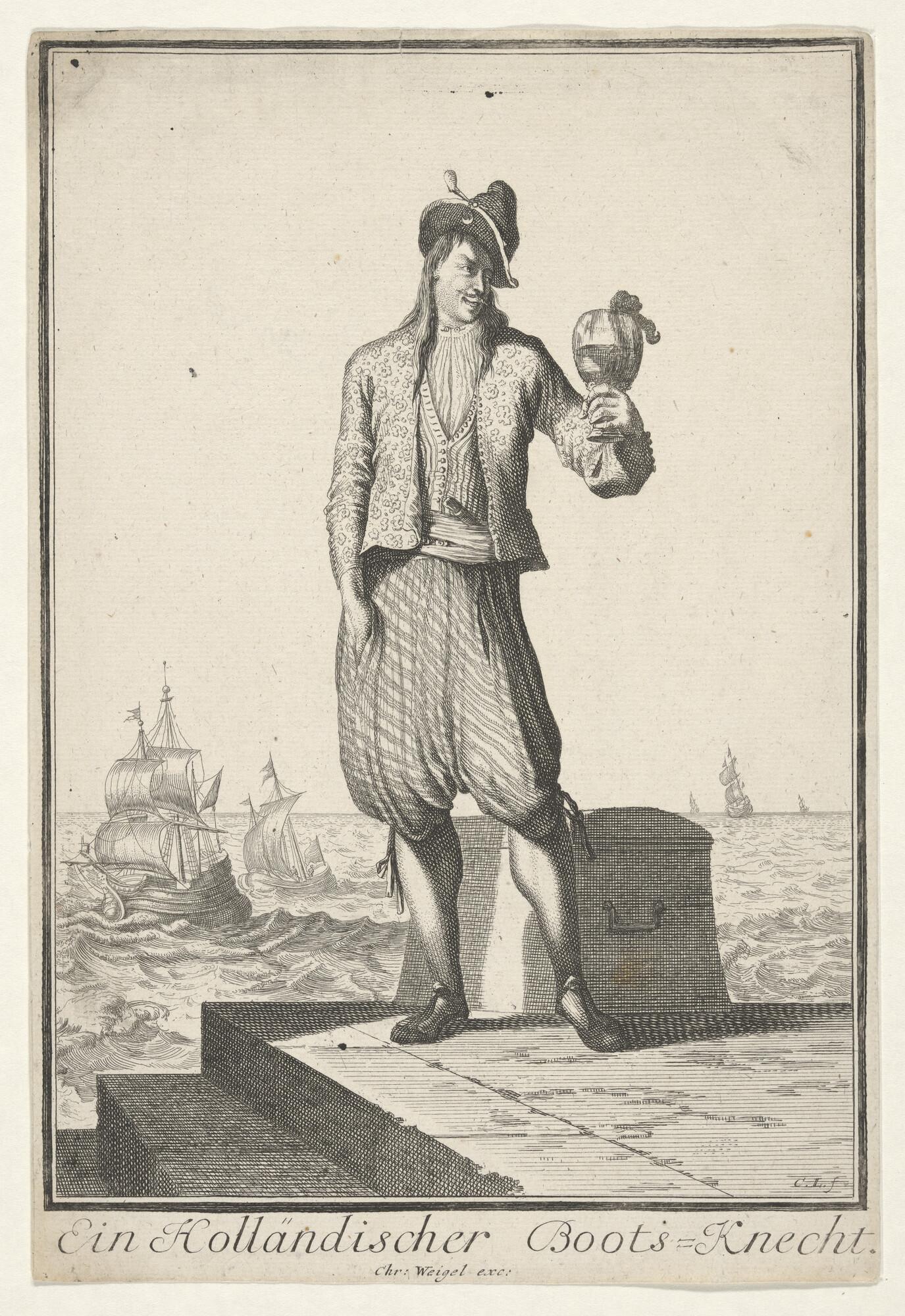 Een bootsknecht met een roemer in zijn hand.