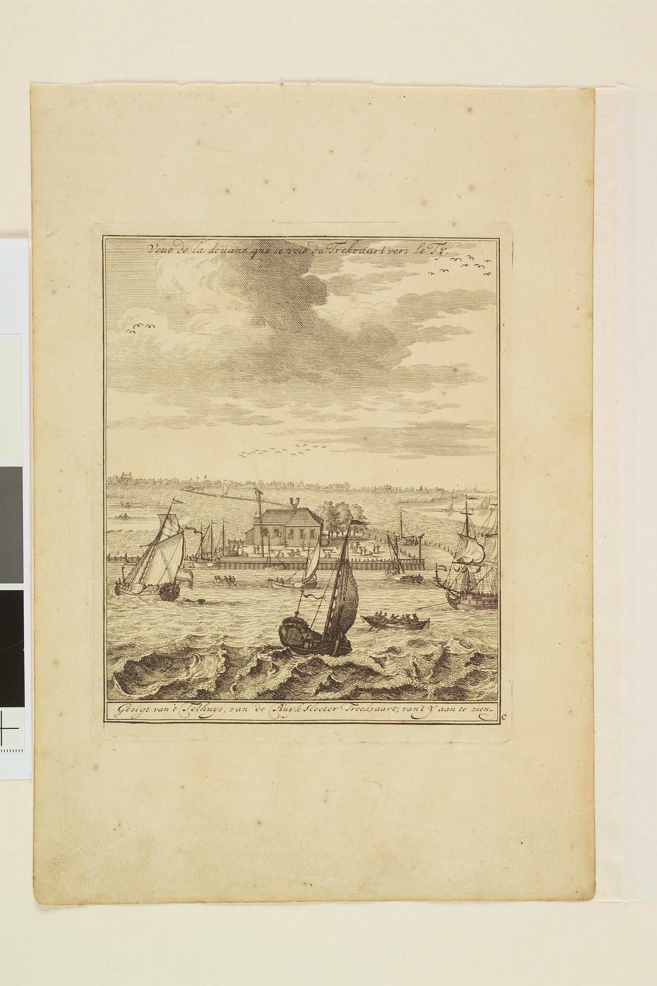Gezicht op het Tolhuis te Buiksloot, aan het IJ, bij de ingang van de Buiksloter Trekvaart. Op de voorgrond zeilt een bezaanjacht.