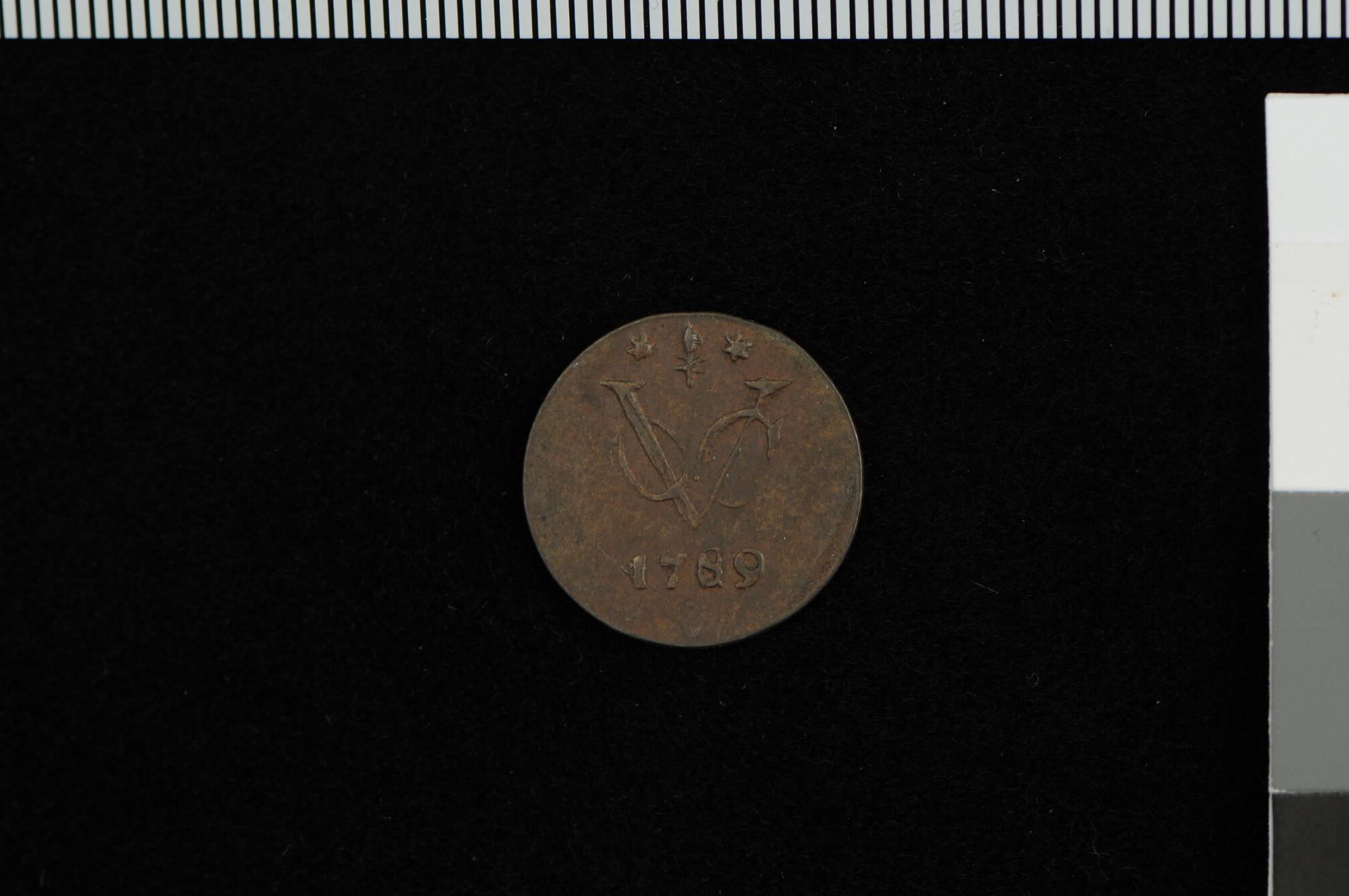 Een halve duit, geslagen in Gelderland voor de VOC, 1789.