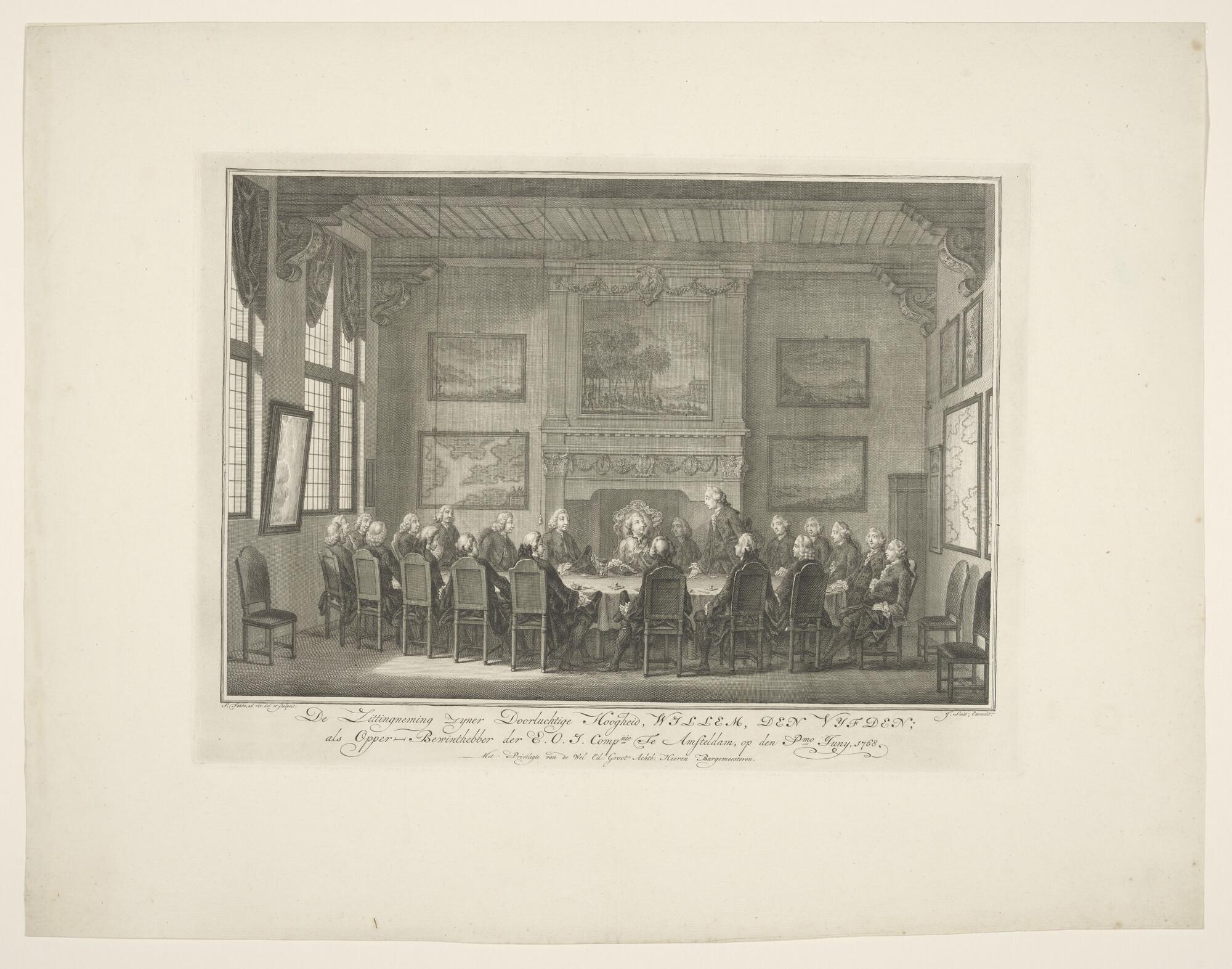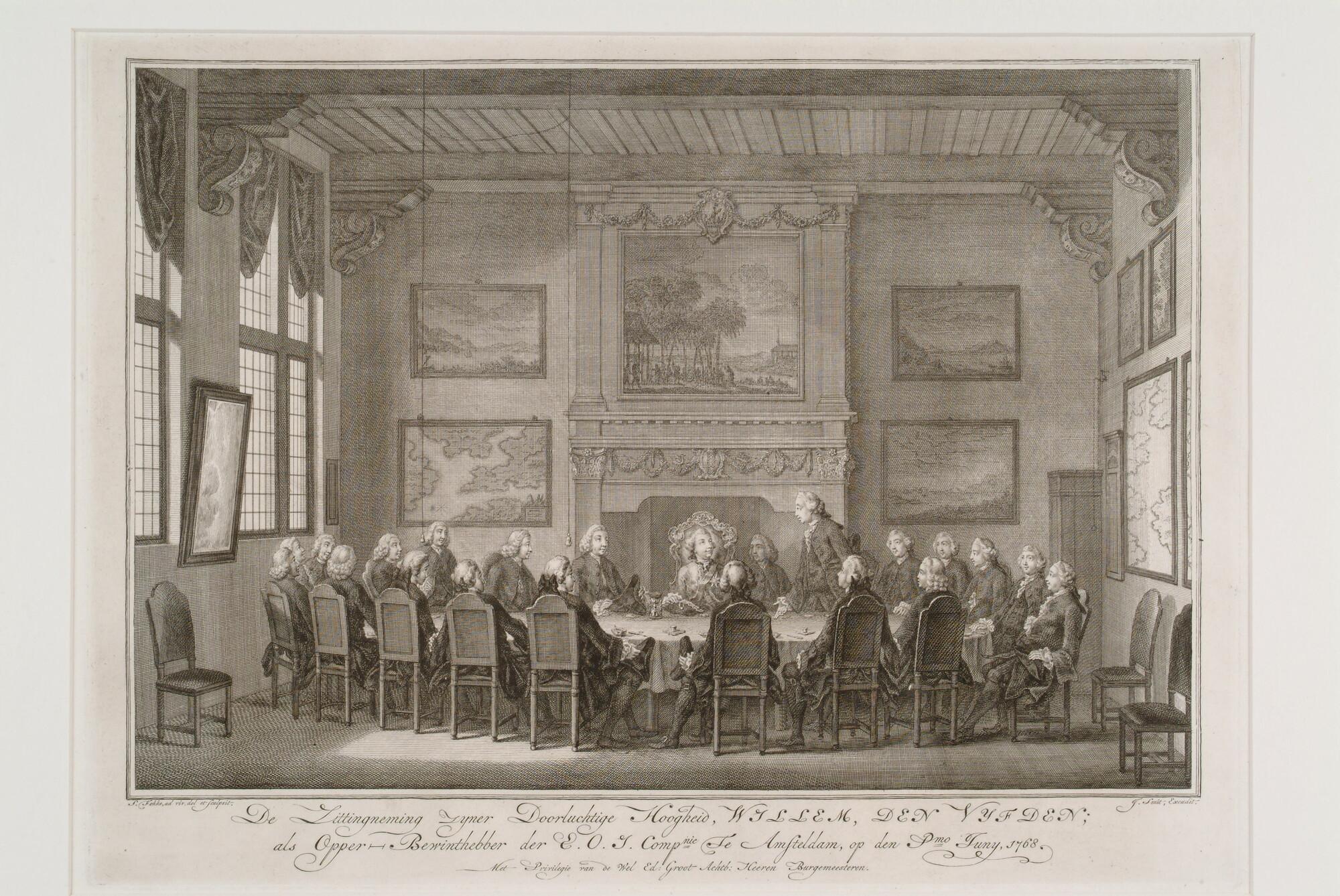De zittingneming van Willem V als opperbewindvoerder van de Verenigde Oostindische Compagnie te Amsterdam op 1 juni 1768.