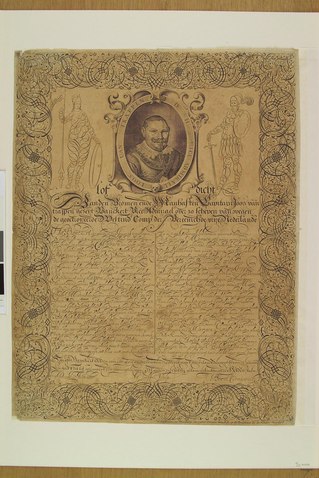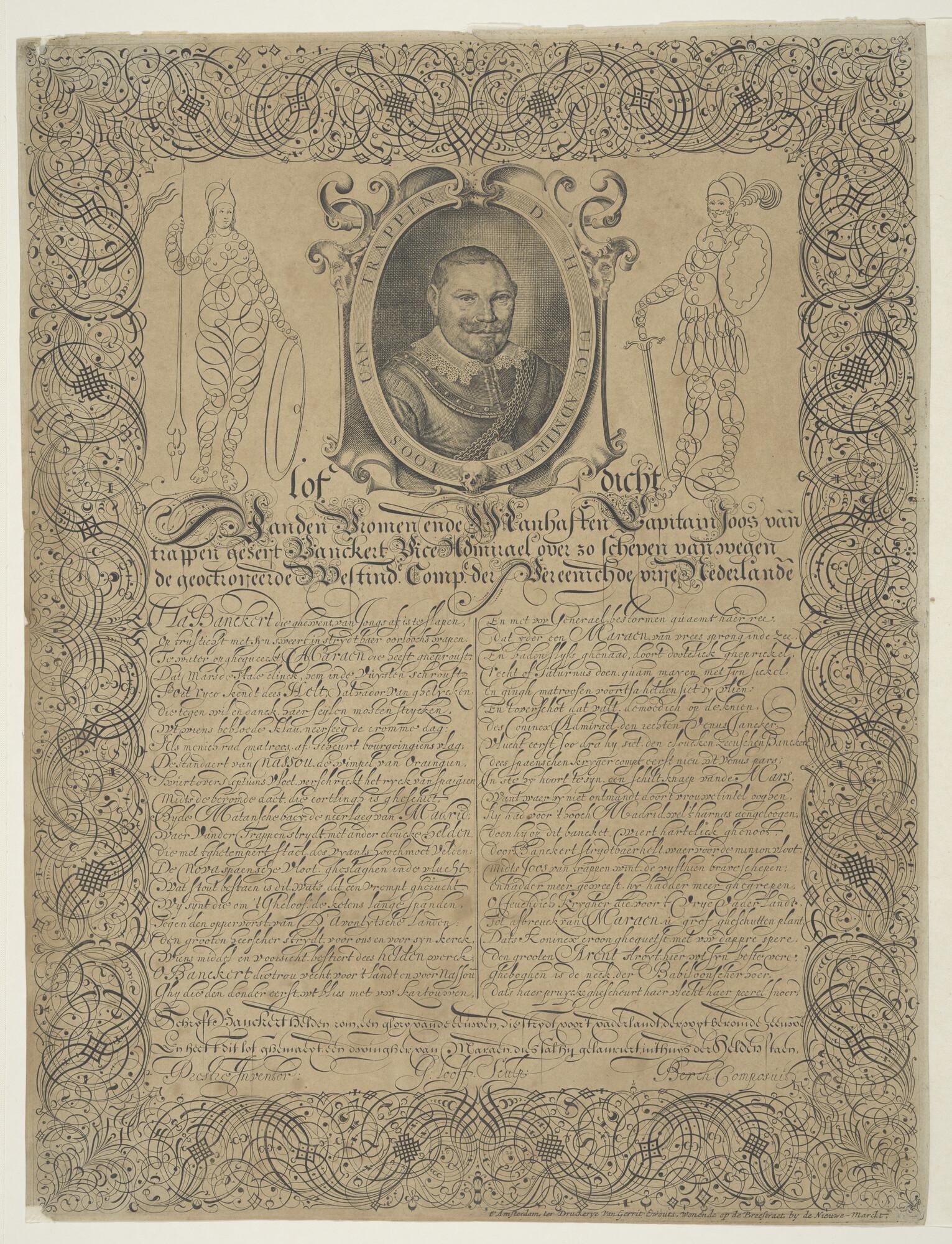 Portret van Joost van Trappen, gezegd Bankert of Banckert, met daaronder een lofdicht en uitbundige versiering in calligrafie.