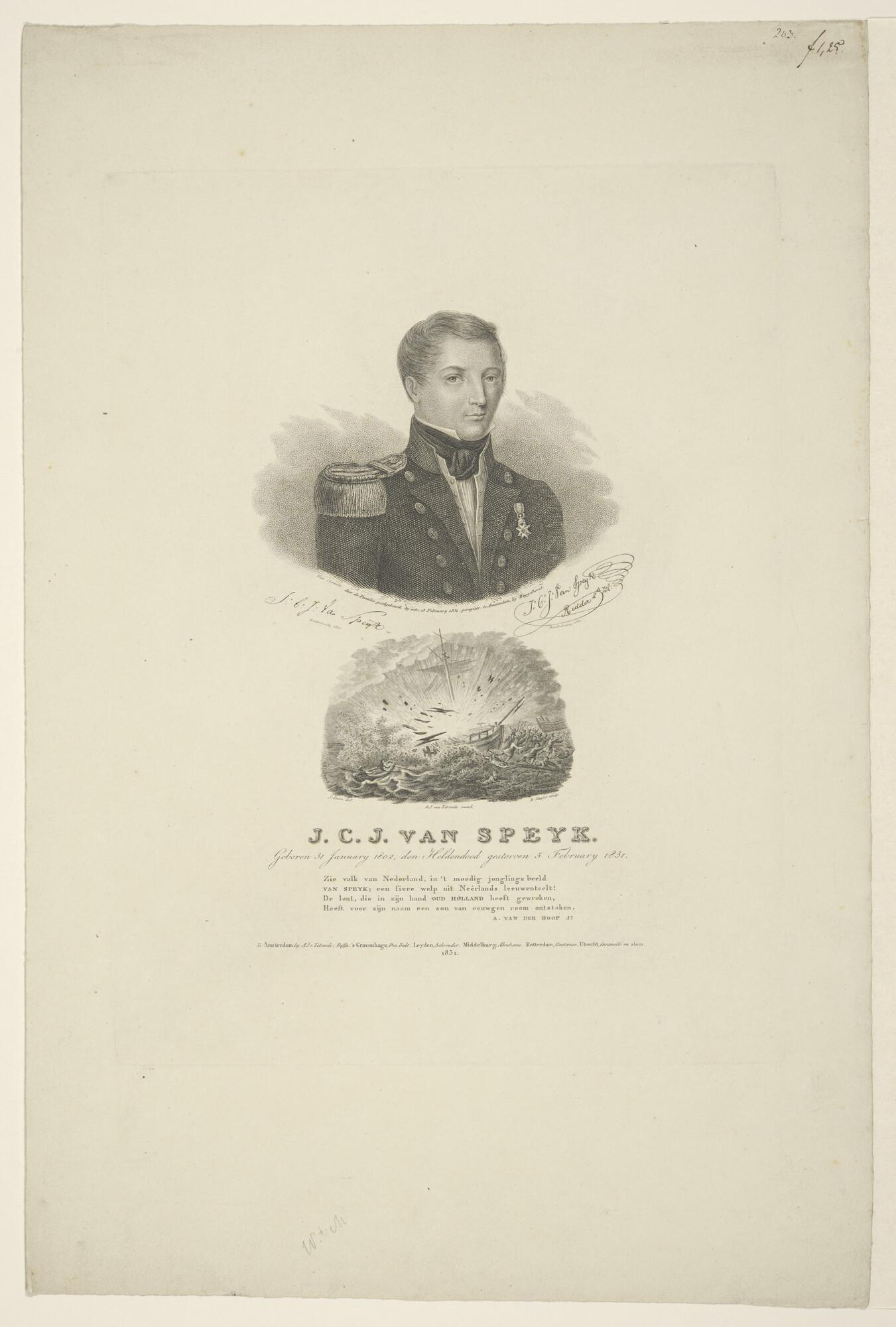 Portret van J.C.J. van Speyk, met daaronder het springen van de Kanonneerboot No. 2