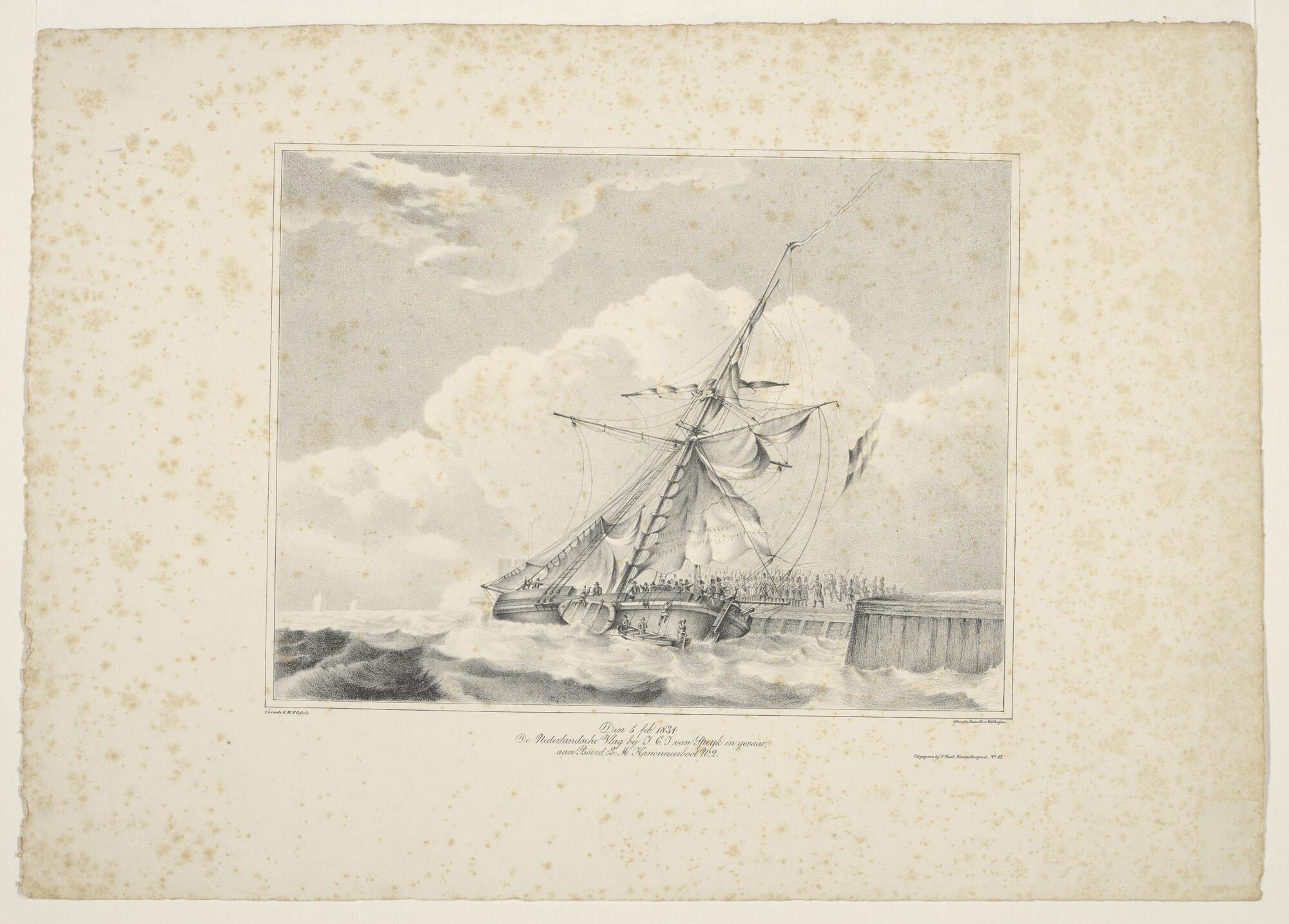 De Nederlandse vlag bij J.C.J. van Speyk in gevaar, rechts de aan de wal liggende kanonneerboot, waarvan een man in het water springt, op de oever talrijke Belgen.