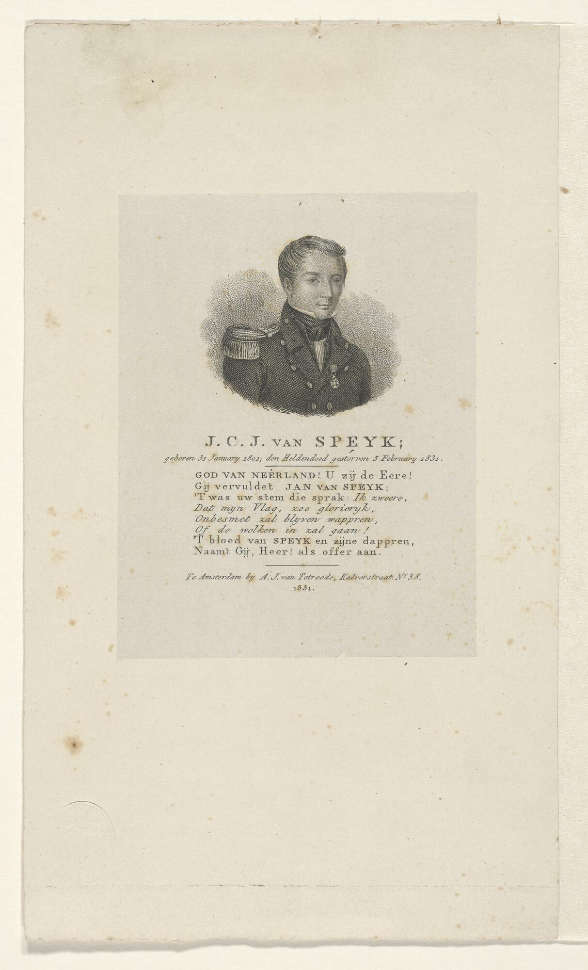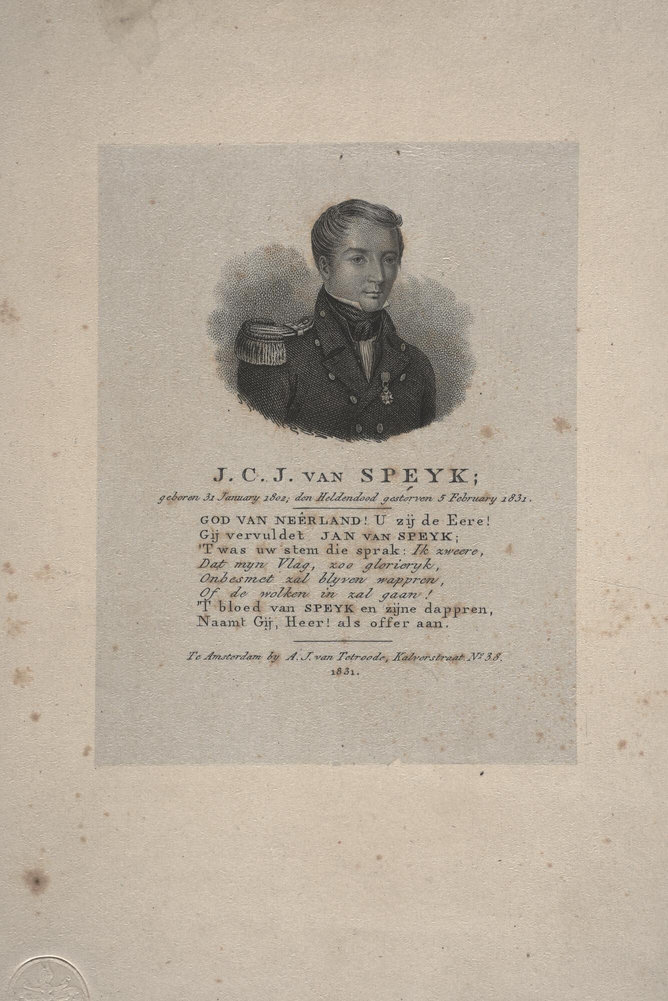 Portret van J.C.J. van Speyk, met daaronder een lofdicht van 8 regels