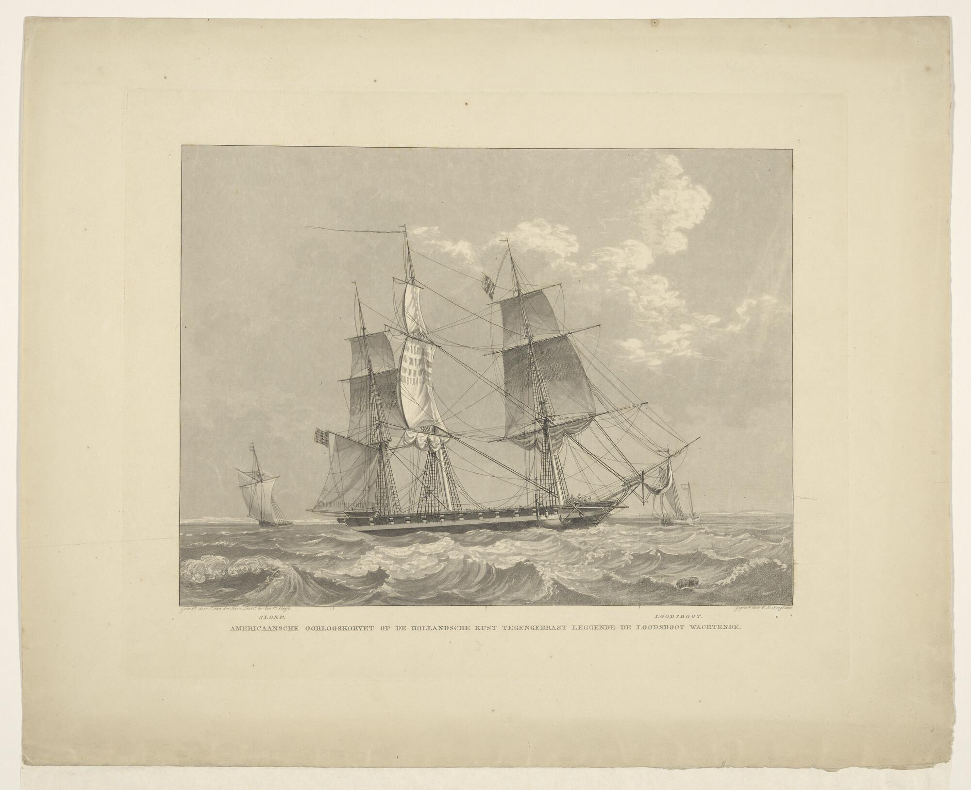 Amerikaans oorlogskorvet tegengebrast op de Hollandse kust, wachtend op de loodsboot.