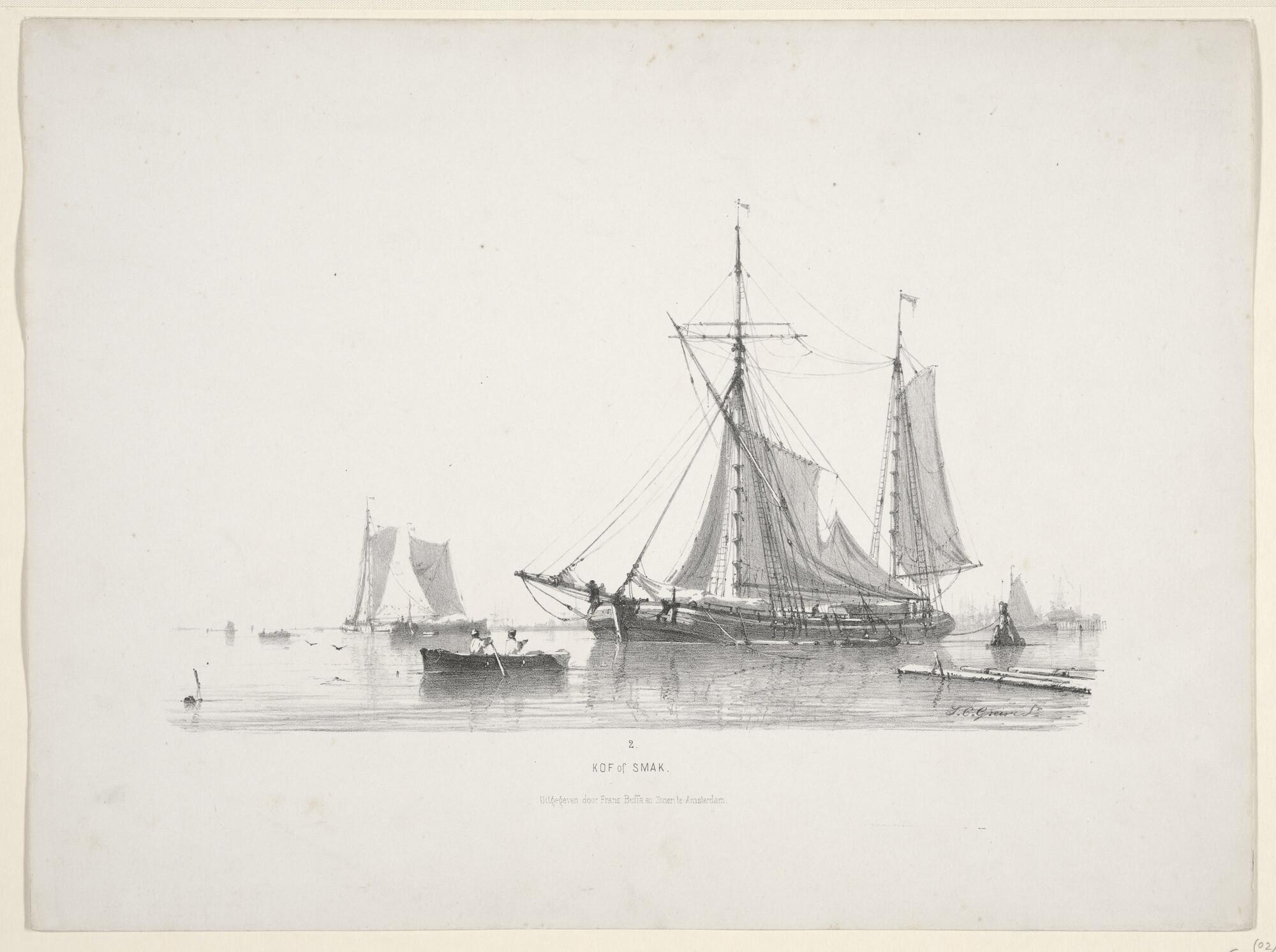 Prentserie "Studien van Hollandsche Schepen", nummer 2: een kof of smak voor anker met op de voorgrond een [roei-] sloepje.