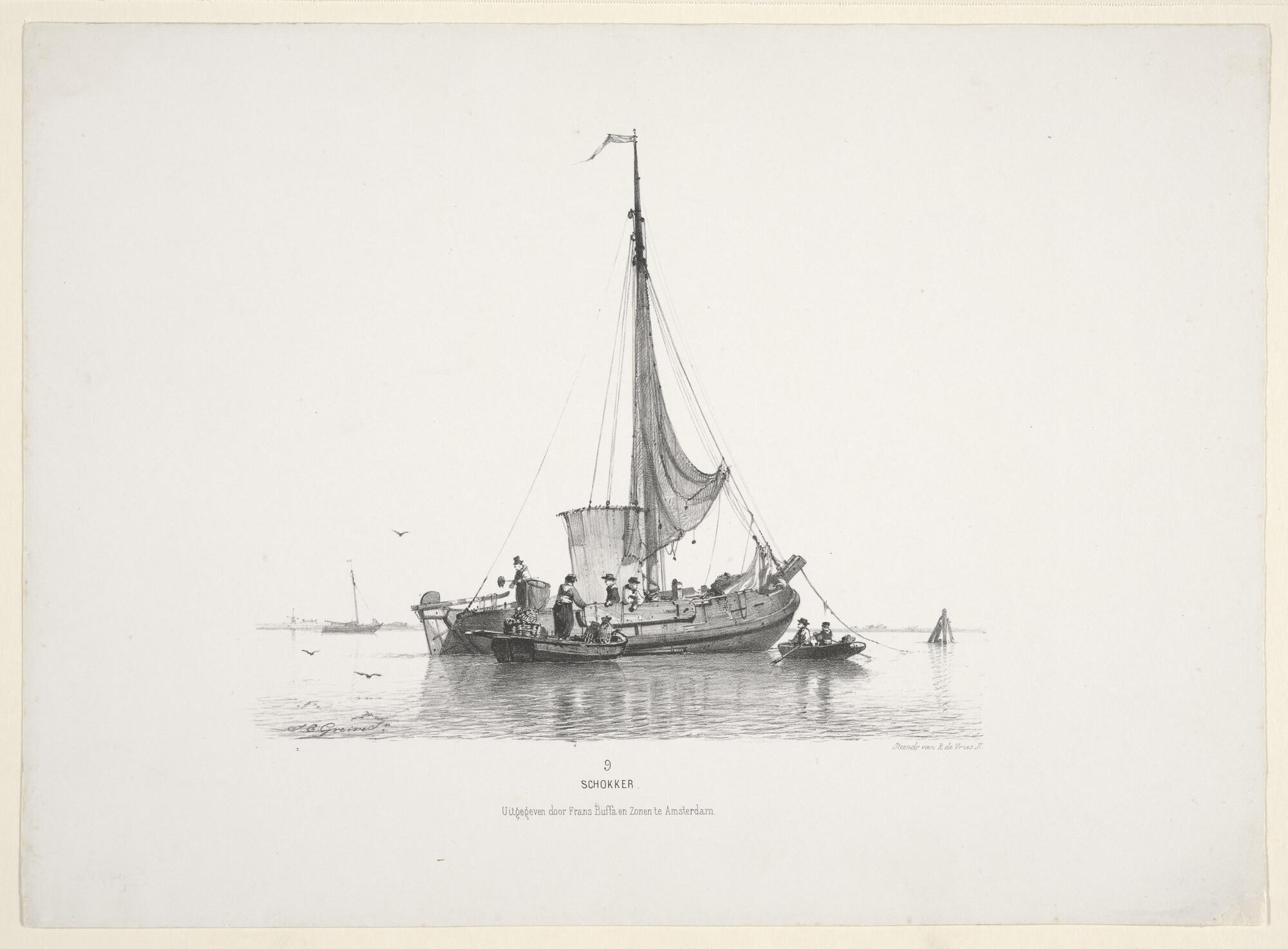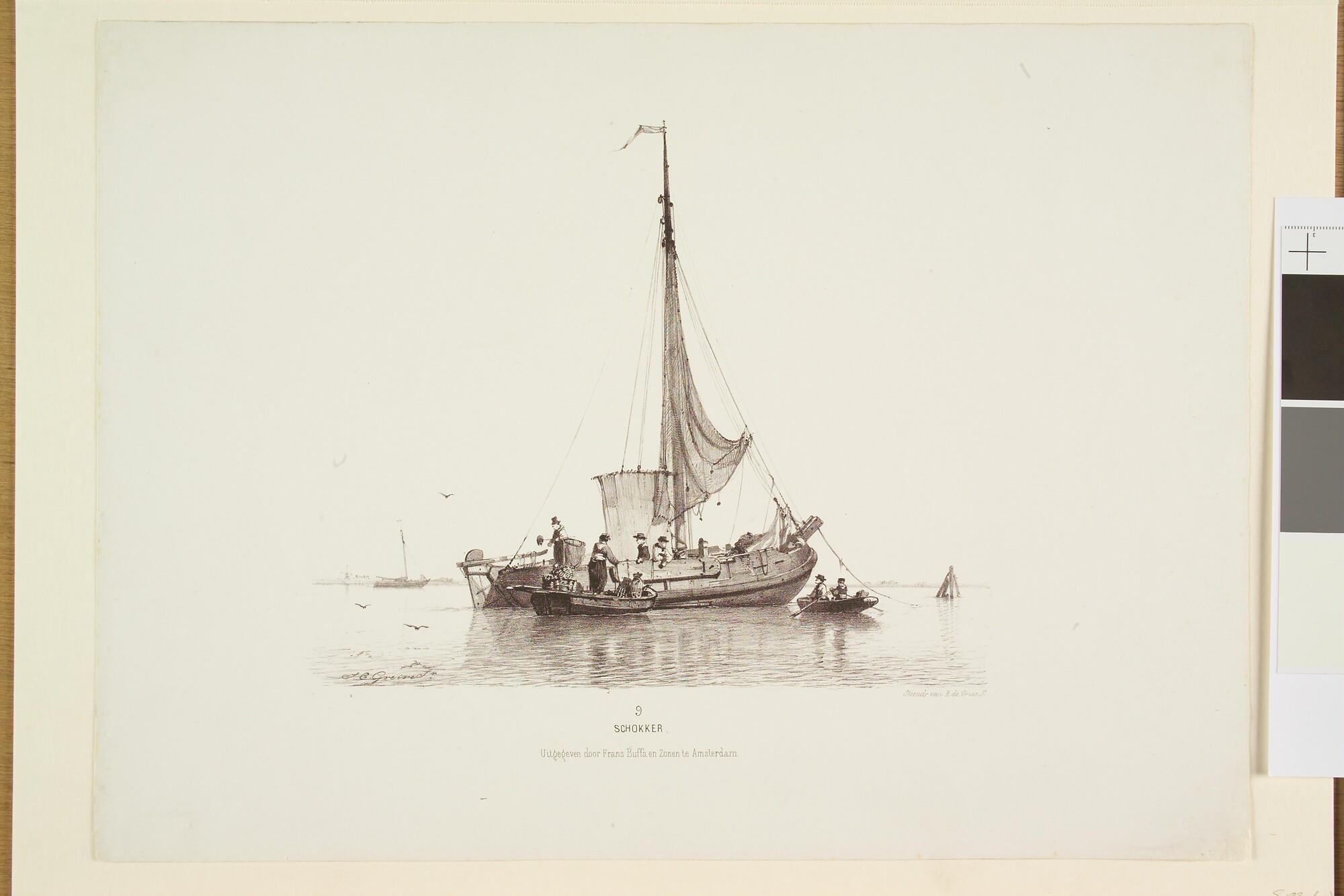 Prentserie 'Studien van Hollandsche Schepen', nummer 9: een schokker voor anker