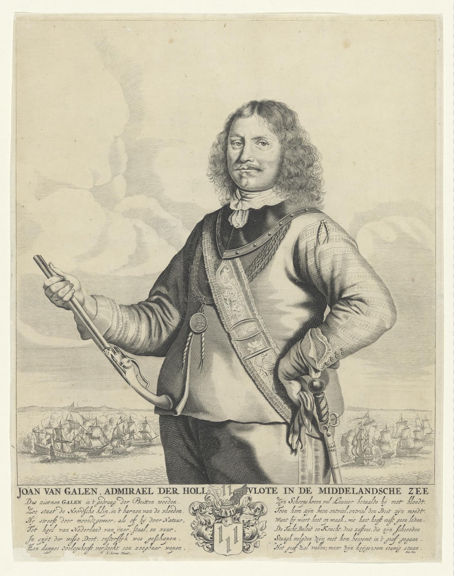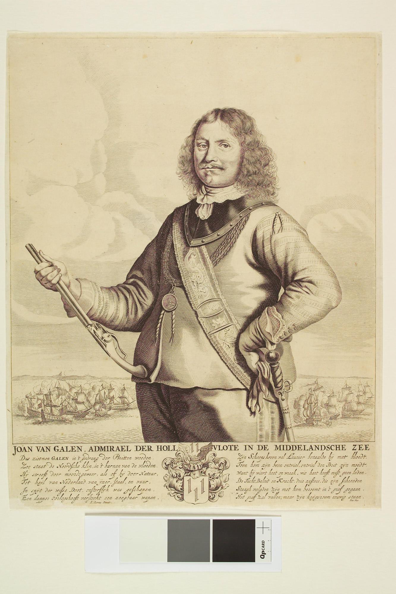 Portret van Admiraal Jan van Galen; middenonder een familiewapen