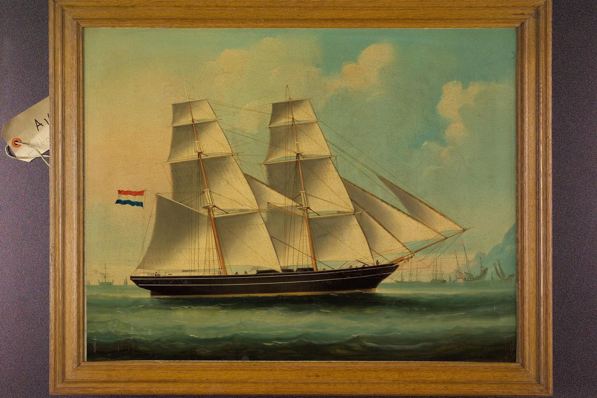 Het brikschip Wilhelmina en Eliza van rederij P. van Rooyen zeilende voor een Oost-Aziatische rede.