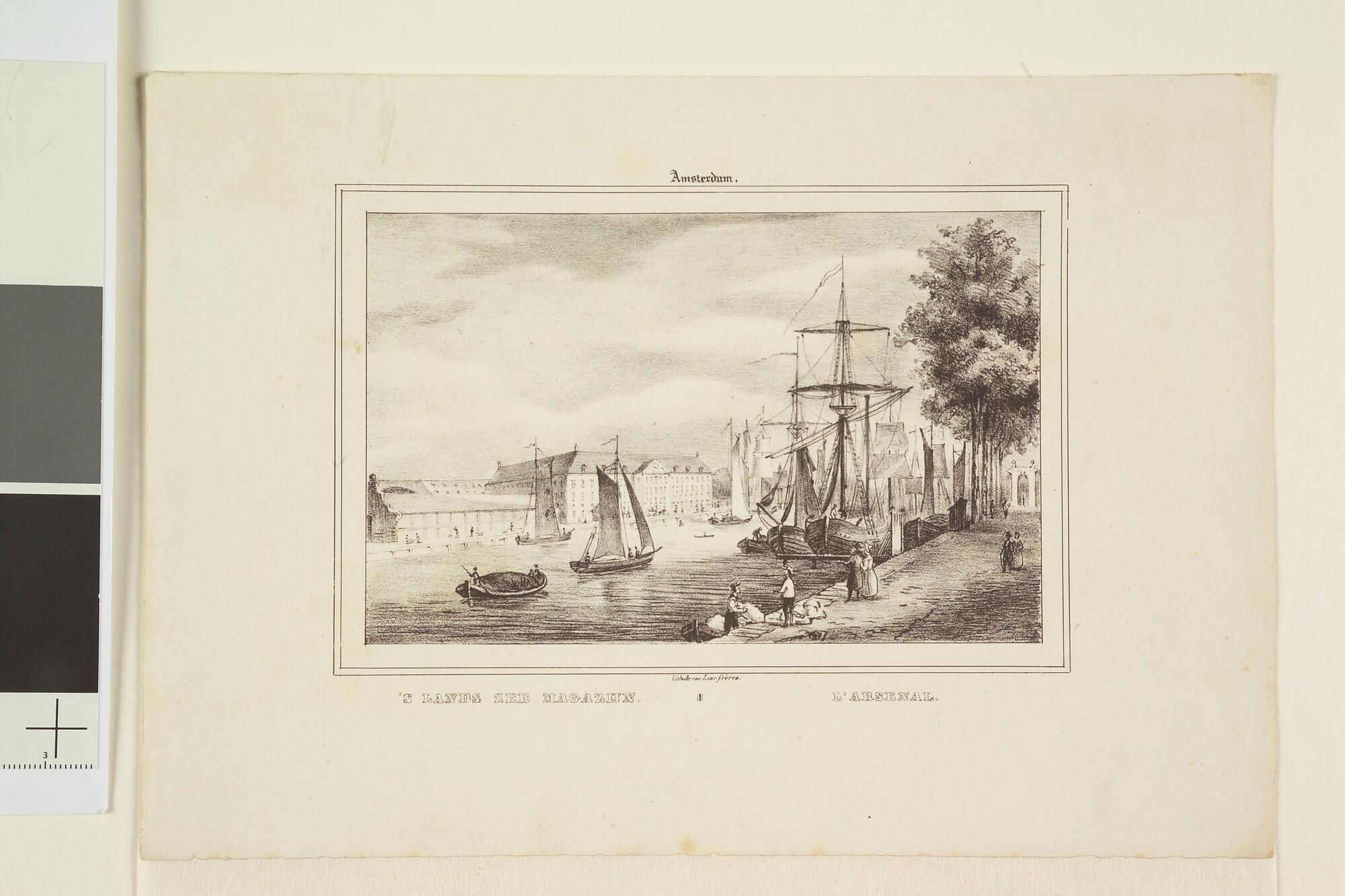 Gezicht op 's Lands Zeemagazijn vanaf de Prins Hendrikkade gezien.