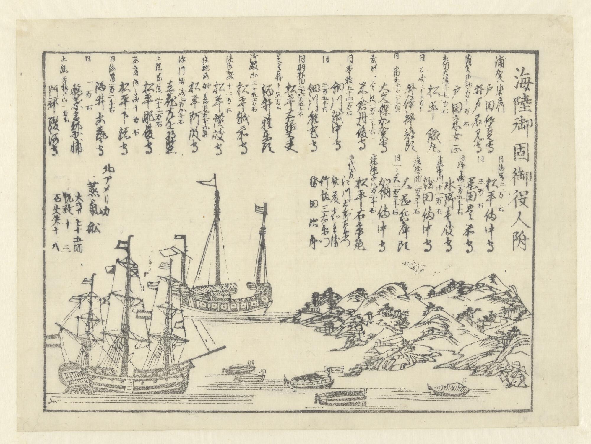Nagasaki-prent: een Nederlandse driemaster op een rede, met een heuvellandschap; rechts van de driemaster een jonk en enige kleine vaartuigen.