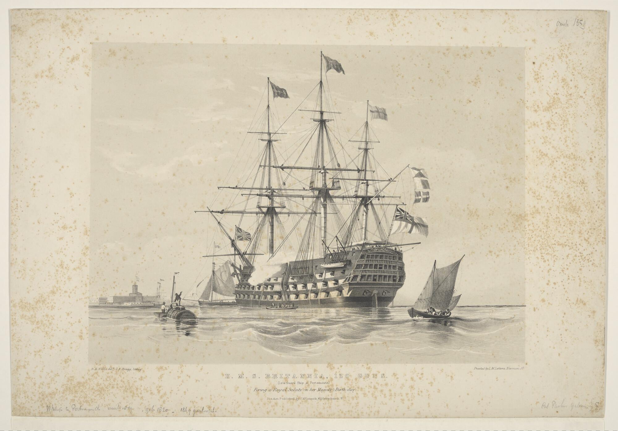 Het Britse HMS "Britannia" vuurt een saluut nabij Portsmouth, omstreeks 1859.