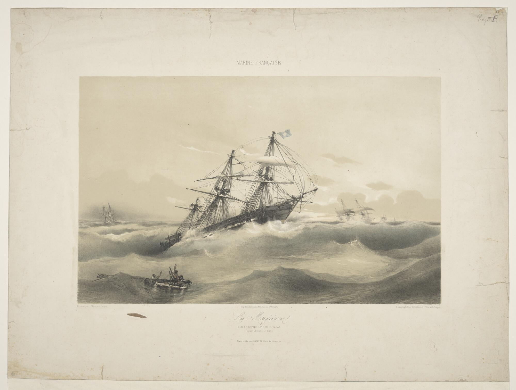 Het Franse fregatschip "La Magicienne" lenzend in een storm bij Bombay.