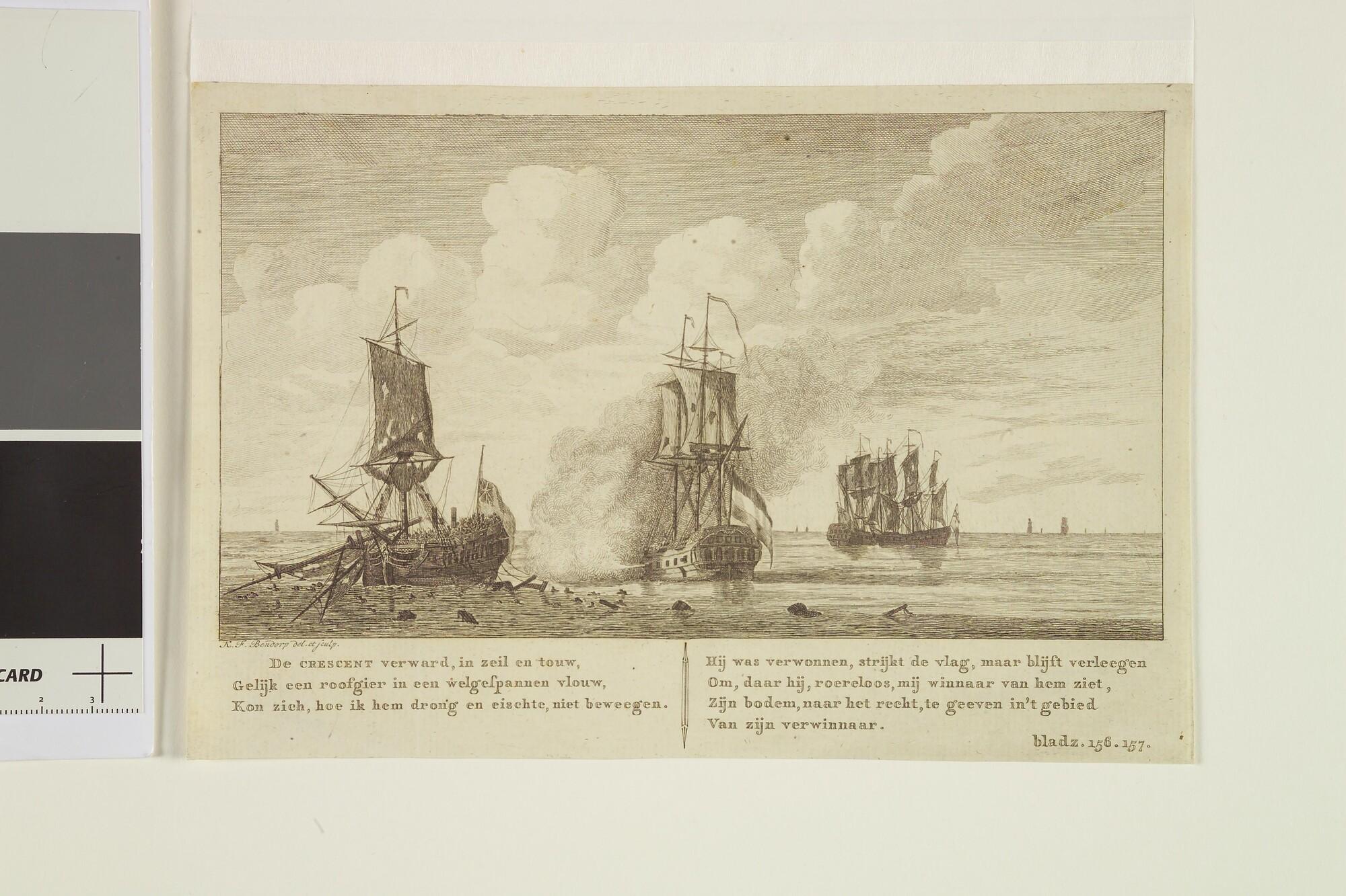 Prent van het gevecht tussen het Engelse schip De Crescent en een Hollands schip.