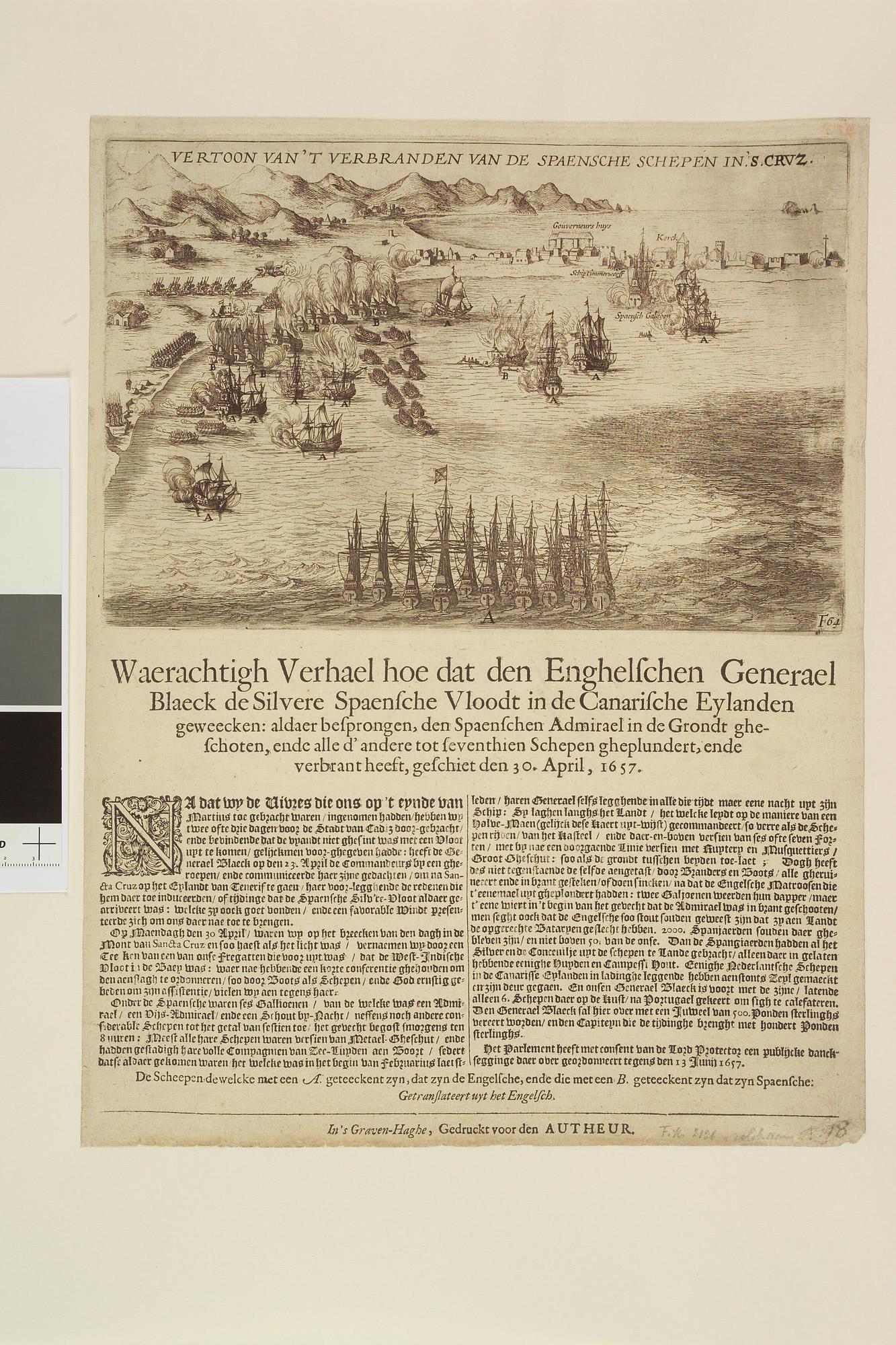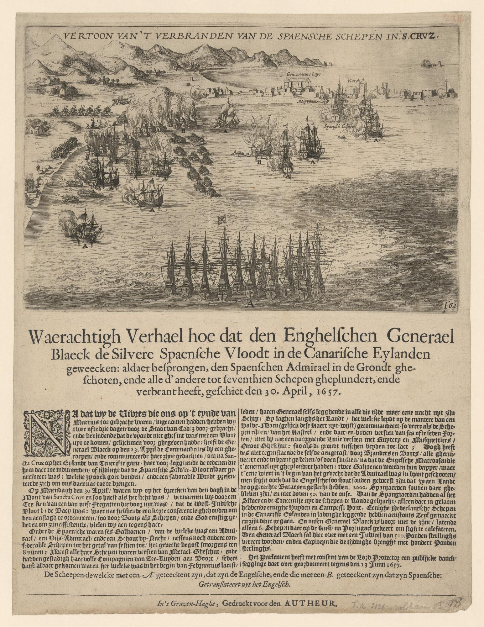 Het verbranden van de Spaanse schepen in de baai van Santa Cruz, 1657, herdruk van een oudere gravure, met wijzigingen.