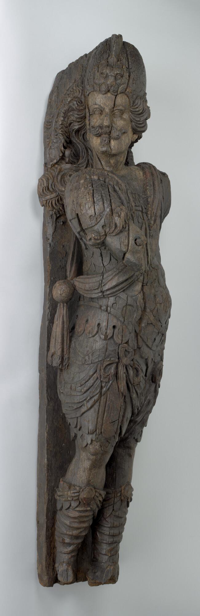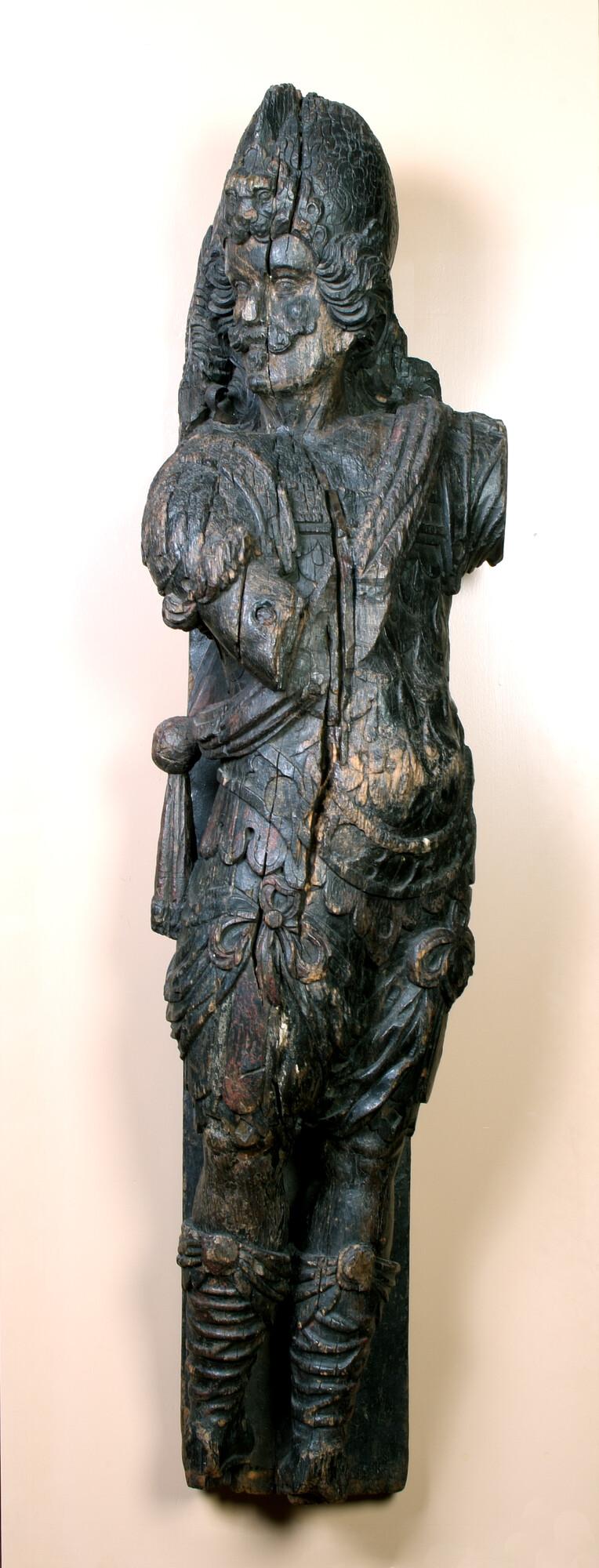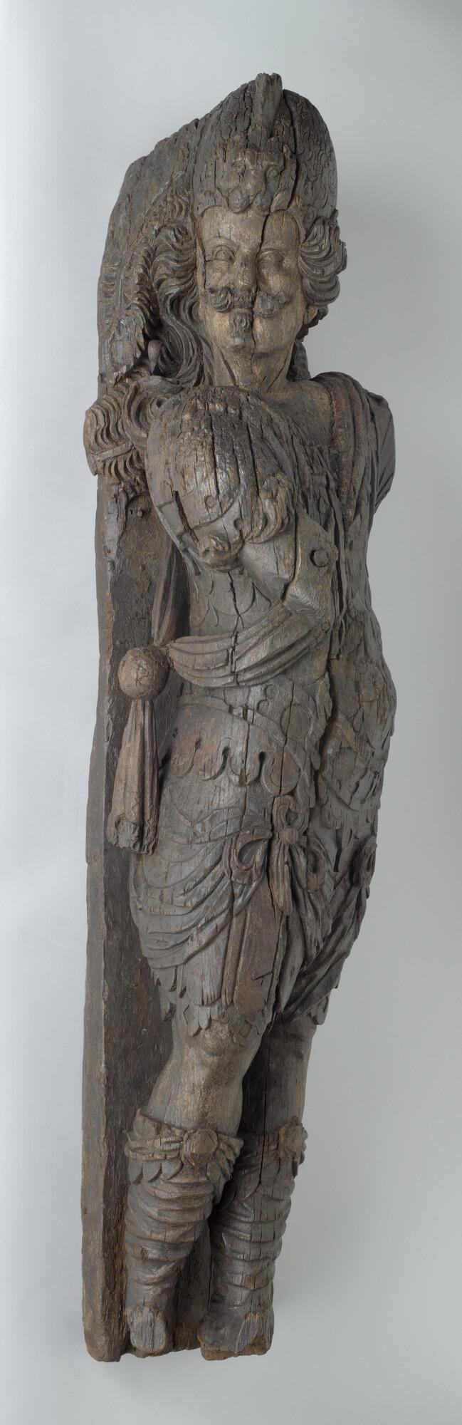 Hoekman: spiegelversiering (ten voeten uit) in de vorm van een mannenfiguur met een naar rechts gedraaid hoofd.