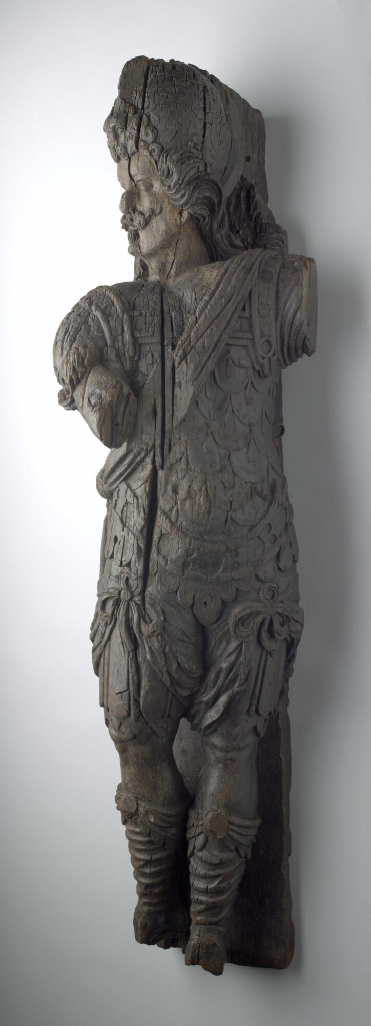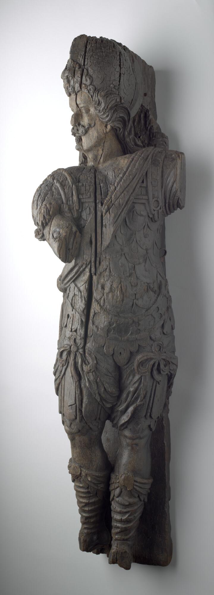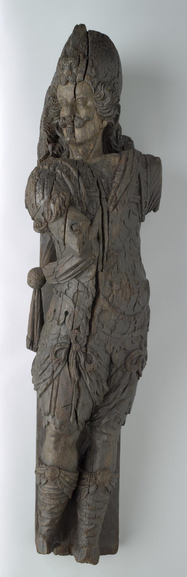 Hoekman: spiegelversiering (ten voeten uit) in de vorm van een mannenfiguur met een naar rechts gedraaid hoofd.