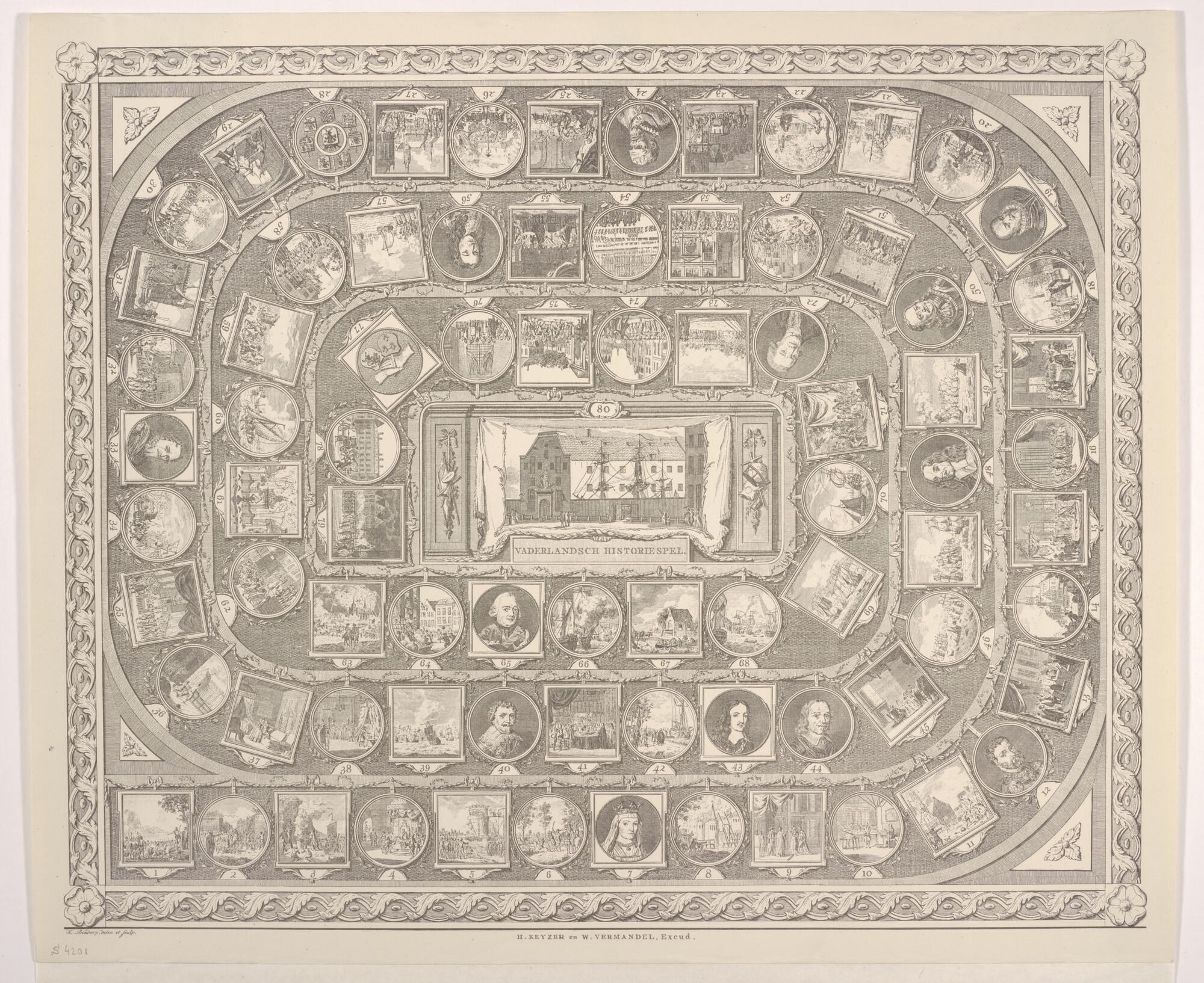 Reproductie van het Vaderlandsch Historiespel met in het midden de Kweekschool voor de Zeevaart.