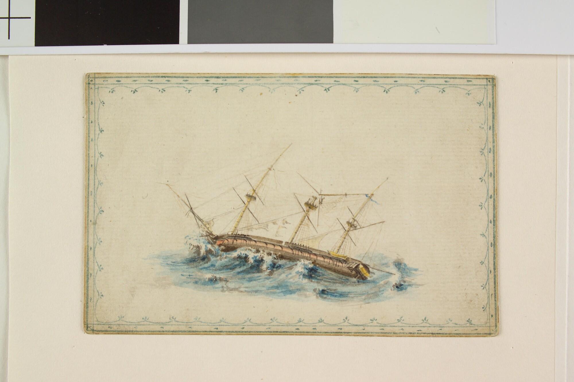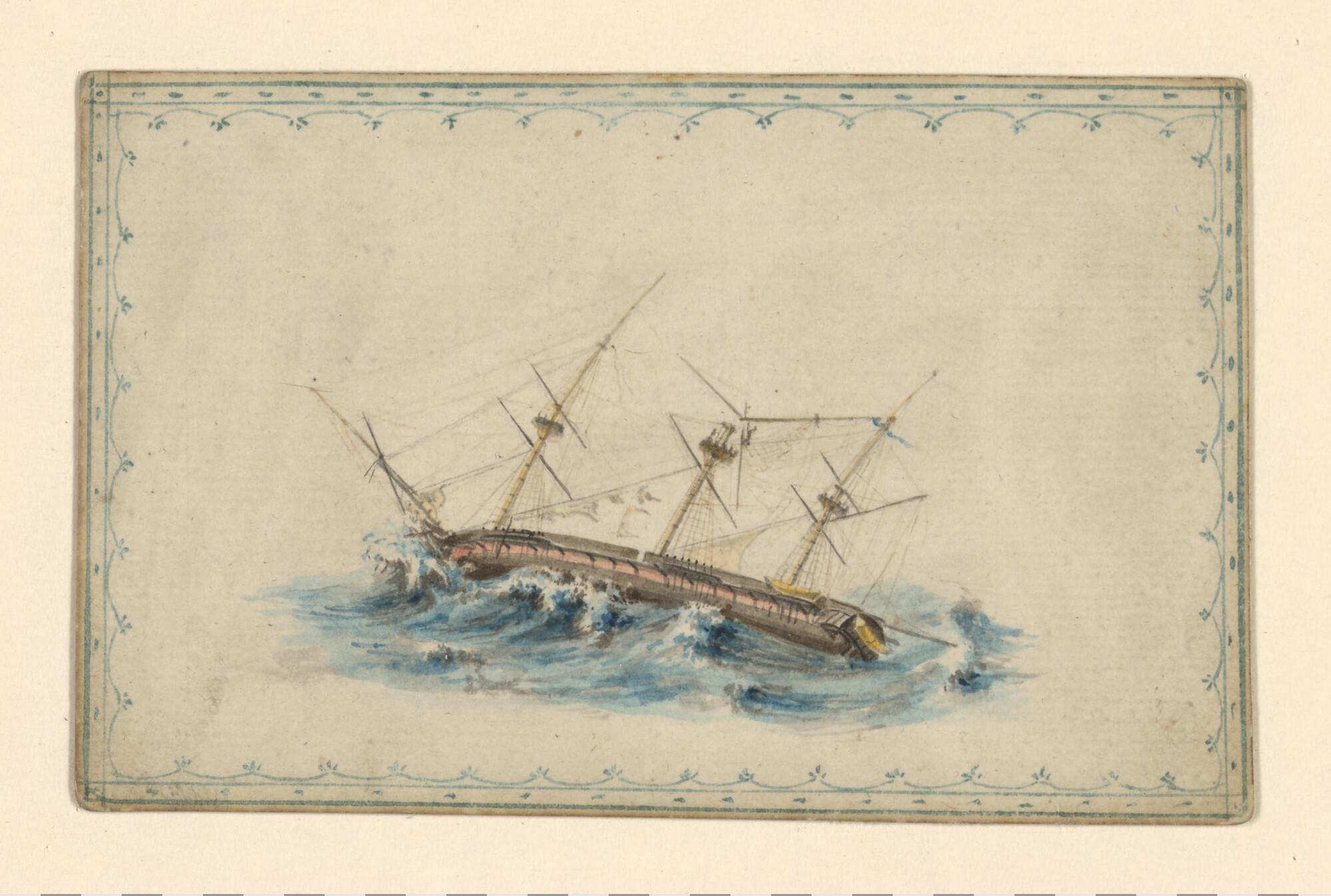 Eén van vier tekeningen uit een liber amicorum: Zr.Ms. IJssel met gebroken grootmars- en grootbramsteng, tijdens een storm op 27 december 1814.