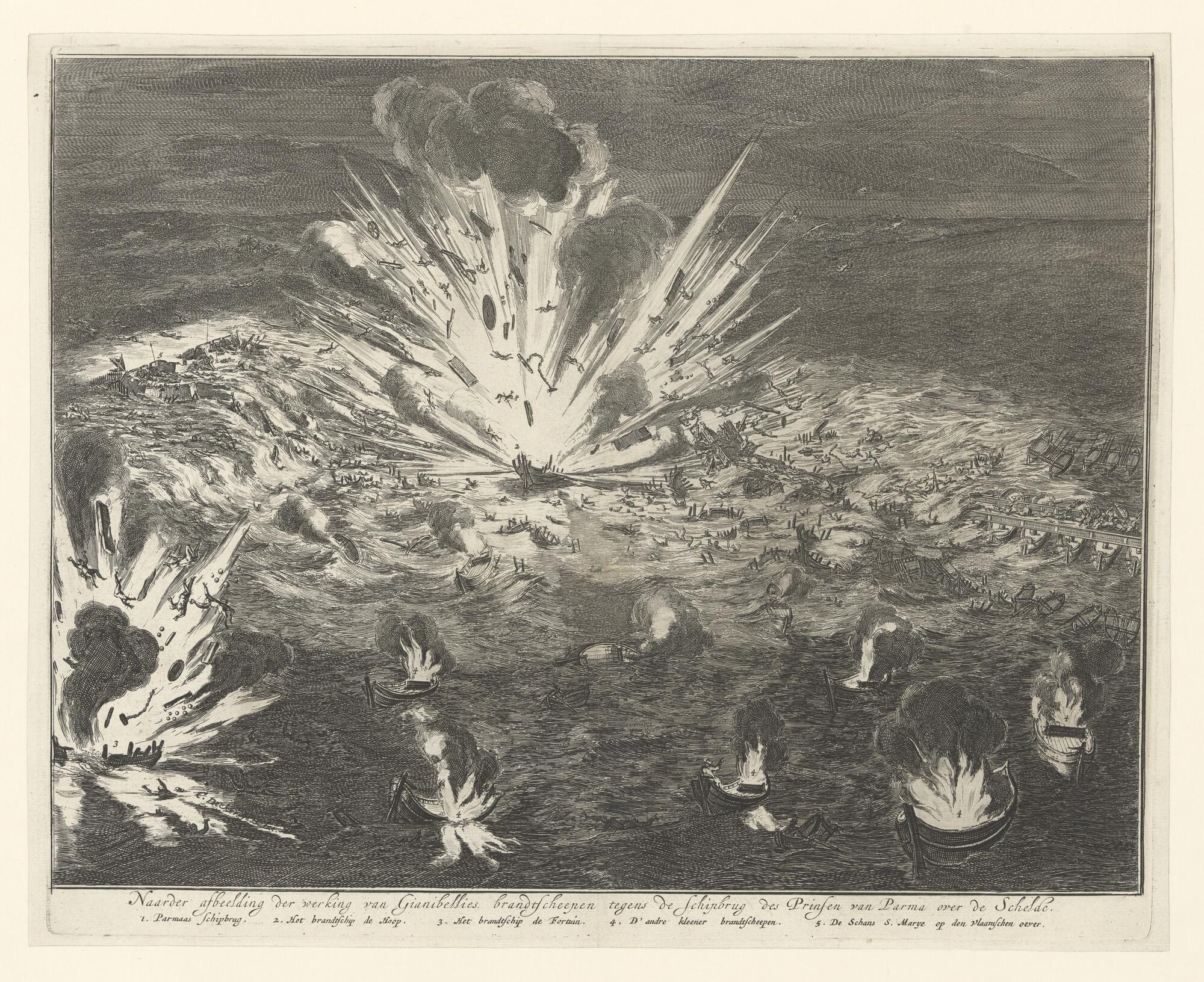 Het opblazen van de schipbrug van de Hertog van Parma over de Schelde bij Antwerpen, door de branders van Gianibelli, 1586.