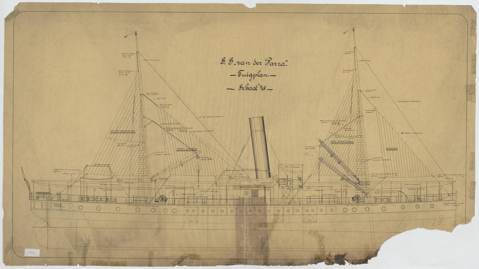 Tuigplan van het vracht- en passagiersschip Van der Parra van de Koninklijke Paketvaart-Maatschappij