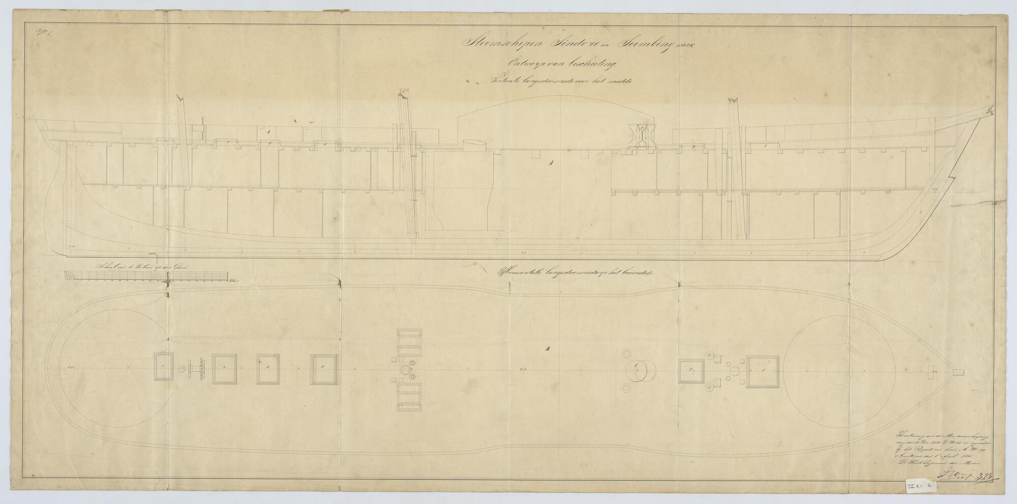 Zr.Ms. "Sindoro" en "Soembing", 1850. 45 x 8 x 5.20 ellen. verticale langsdoorsnede, bovenaanzicht, met beschieting. (zie 10).